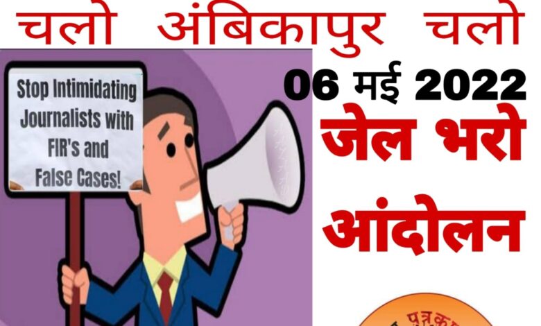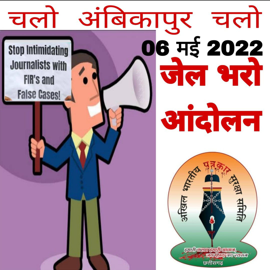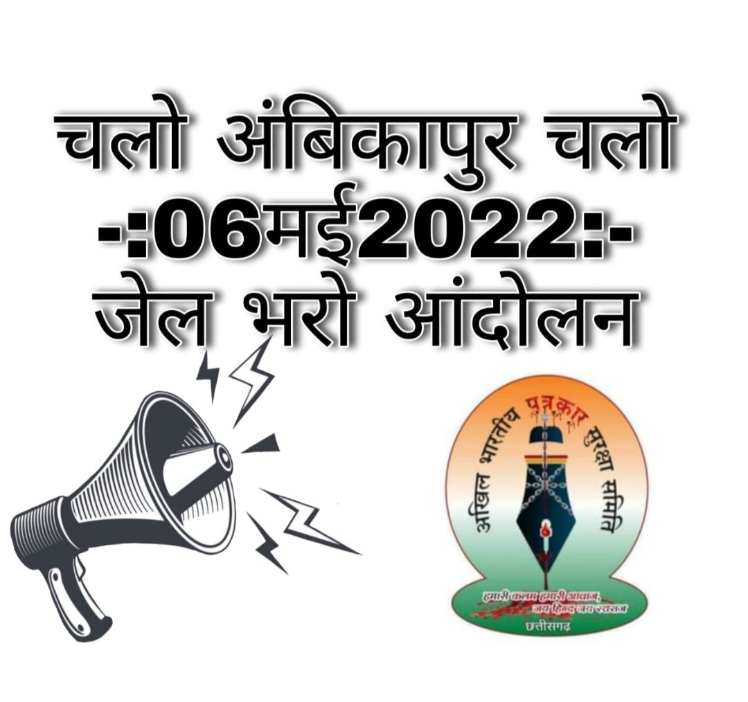 अम्बिकापुर-: छत्तीसगढ़ का सबसे बड़ा संगठन अखिल भारतीय पत्रकार सुरक्षा समिति छत्तीसगढ़ के द्वारा प्रदेश में सरकार एवं प्रशासनिक अत्याचार बन्द करने , बिना जांच पत्रकारों पर हुई एफआईआर की वापस लेने एवं जेल में बंद पत्रकारों को नि:शर्त रिहा के साथ प्रदेश में पत्रकार सुरक्षा कानून लागू किया जाए को लेकर 6 मई को अम्बिकापुर में प्रदेश स्तरीय धरना,ज्ञापन एवं जेलभरो आंदोलन किया जाएगा । धरना प्रदर्शन में प्रदेश के हजारों की संख्या में पत्रकार अम्बिकापुर में पहुँचने की बात कहि है।