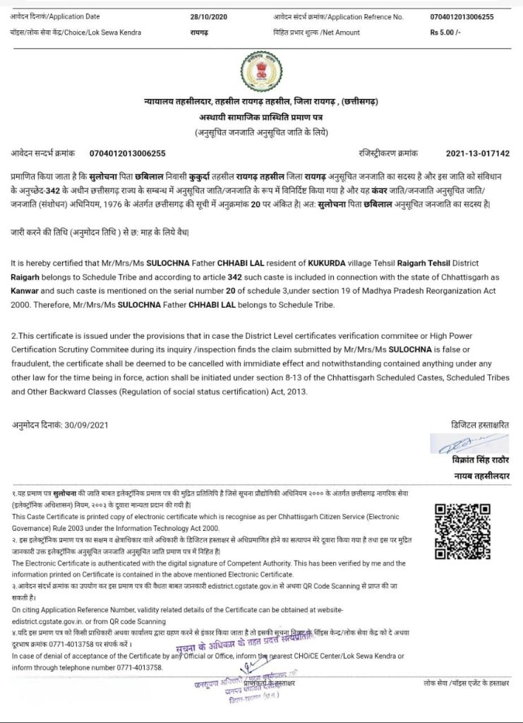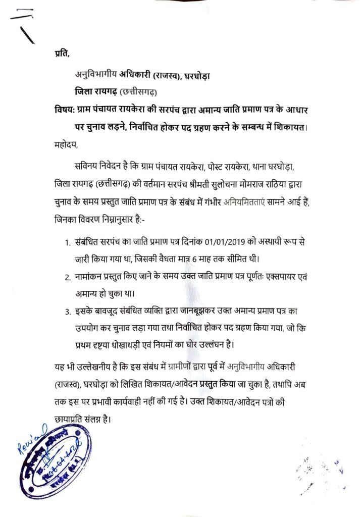 रायगढ़। जिला रायगढ़ के घरघोड़ा अनुविभाग अंतर्गत ग्राम पंचायत रायकेरा की सरपंच श्रीमती सुलोचना मोमराज राठिया के खिलाफ गंभीर अनियमितताओं की शिकायत सामने आई है। शिकायत में आरोप लगाया गया है कि उन्होंने चुनाव के दौरान एक अमान्य (एक्सपायर) जाति प्रमाण पत्र के आधार पर नामांकन दाखिल कर चुनाव लड़ा और निर्वाचित होकर पद भी ग्रहण कर लिया।