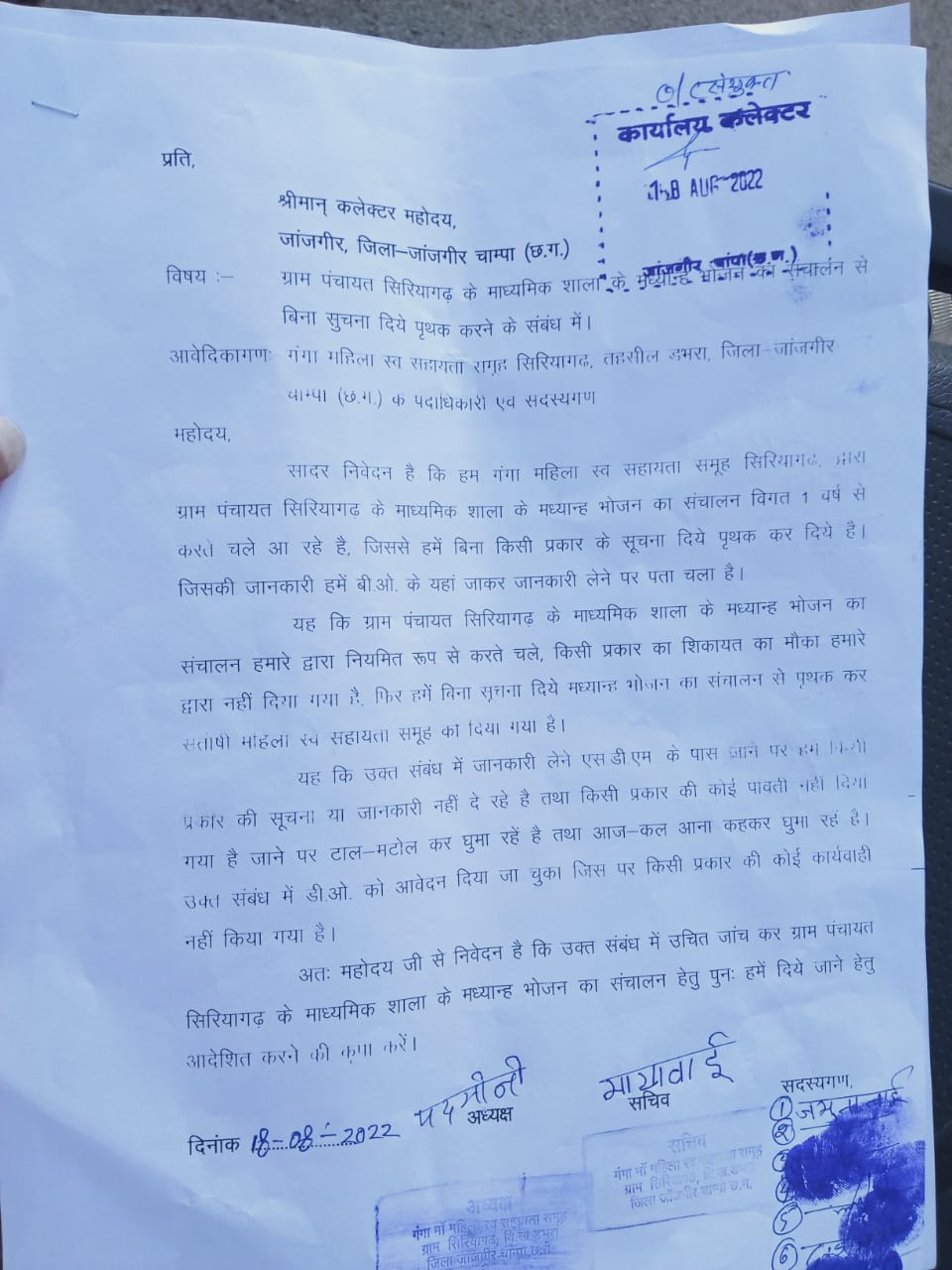 उक्त संबंध में जानकारी लेने समूह द्वारा एस.डी.एम के पास जाने पर सूचना या जानकारी नहीं दे रहे है तथा किसी प्रकार की कोई पावती नहीं दिया गया व जानकारी मांगने पर टाल-मटोल कर घुमा रहें है तथा आज-कल आना कहकर घुमा रहे है तत्पश्चात उक्त संबंध में D.E.O. को आवेदन दिया जा चुका जिस पर किसी प्रकार की कोई कार्यवाही नही होने पर अंततः समूह द्वारा कलेक्टर को आवेदन प्रस्तुत कर उक्त संबंध में उचित जांच कर ग्राम पंचायत सिरियागढ़ के माध्यमिक शाला के मध्यान्ह भोजन का संचालन हेतु पुनः गंगा महिला स्व सहायता समूह को दिये जाने हेतु आदेशित कर आवेंदन के साथ गुहार लगाई है…।