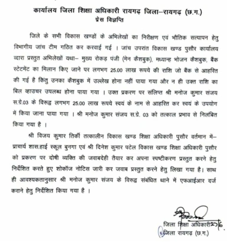 पुसौर:- रायगढ़ जिले के सभी विकासखण्डों के अभिलेखों का निरीक्षण एवं भौतिक सत्यापन हेतु विभागीय जांच टीम गठित कर करवाई गई थी व जांच उपरांत विकासखण्ड पुसौर कार्यालय व्दारा प्रस्तुत अभिलेखों यथा- मुख्य रोकड़ बही(मेन कैशबुक), मध्यान्ह भोजन कैशबुक, बैंक स्टेटमेंट का मिलान किए जाने पर लगभग 25.00 लाख रूपये की राशि जो बैंक से आहरित की गई है किंतु उनका कैशबुक में उल्लेख होना नहीं पाया गया और न ही उक्त राशि का बिल व्हाउचर उपलब्ध होना पाया गया।उक्त प्रकरण पर संलिप्त श्री मनोज कुमार संजय स.ग्रे.03 के विरूद्व लगभग 25.00 लाख रूपये स्वयं के नाम से आहरित कर स्वयं के उपयोग में किया जाना पाया गया।