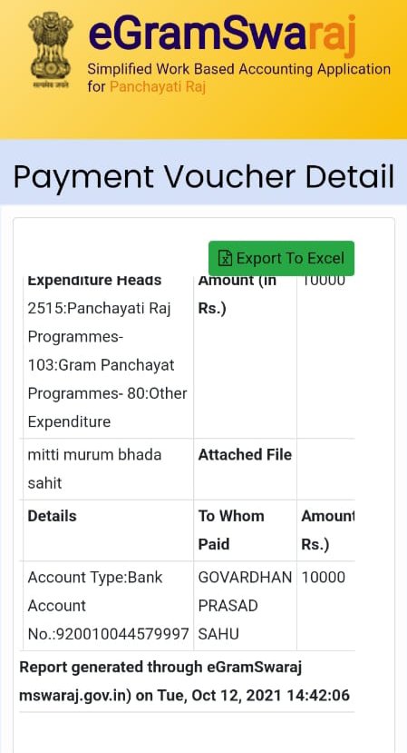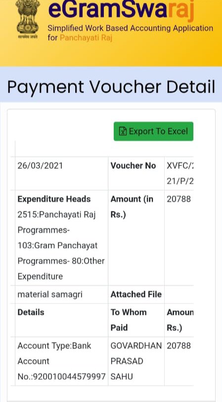 सरपंच गोवर्धन साहू के नाम पर- चुना दस्त धुलाई 6000/-,मिट्टी मुरुम धुलाई 31600/-,मटेरियल सामग्री 31188/-,पे फोर गिट्टी धुलाई कार्य 9600/-