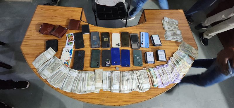 जप़्त मशरूका 1 चादर,52 पत्ति ताश,बिजली तार व बल्व नगदी रकम 140000रू 14 नग स्क्रीनटच मोबाईल व 08 नग मो.सा. के साथ आरोपिगण गिरफ़तार ।