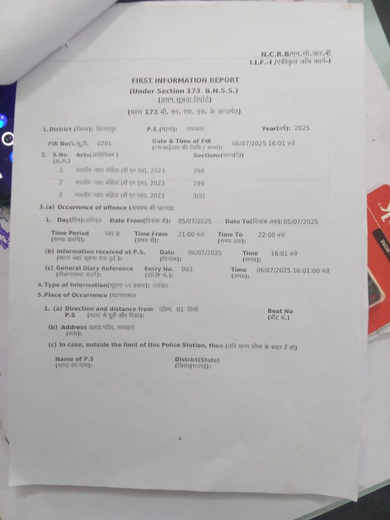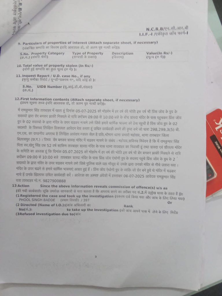 बिलासपुर। तारबहार शारदा मंदिर के ऊपर मोहर्रम में शेर बन कर नाचने की घटना में एक नया तथ्य सामने आया जिसमें तारबहार पुलिस बिलासपुर छत्तीसगढ़ द्वारा एक हिन्दू लड़के अनुभव कछवाहा को गिरफ्तार कर माननीय न्यायिक दंडाधिकारी पीठासीन अधिकारी कुमारी कोनिका यादव जी के न्यायालय में आज दिनांक 09/07/2025 को अंतर्गत धारा 298, 299, 3(5) भारतीय न्याय संहिता, 2023 के अंतर्गत रिमांड लेने हेतु पेश किया जिस पर अनुभव कछवाहा के अधिवक्ता सैय्यद जायेद जिया अली एवं अधिवक्ता निशा साहू द्वारा रिमांड पर आपत्ति करते हुए अनुभव कछवाहा को बेल देने हेतु निवेदन किया गया और न्यायालय में तर्क प्रस्तुत किया कि अनुभव कछवाहा स्वयं हिन्दू धर्म का अनुयाई है और हिन्दू धर्म के प्रति पूरी आस्था रखता है और सभी देवी देवताओं का सम्मान करता है और अनुभव कछवाहा कभी भी शेर बन कर नाच नहीं किया है और तारबहार पुलिस द्वारा असली दोषी को न पकड़ कर अनुभव कछवाहा को झूठा फसाया गया है जिस पर माननीय न्यायिक दंडाधिकारी पीठासीन अधिकारी कुमारी कोनिका यादव न्यायालय द्वारा अनुभव कछवाहा के अधिवक्ता सैय्यद जायेद जिया अली के तर्क सुन कर अनुभव कछवाहा के पक्ष में आदेश करते हुए अनुभव कछवाहा को तुरंत जमानत का लाभ प्रदान कर दिया गया और तारबहार पुलिस द्वारा रिमांड हेतु प्रस्तुत आवेदन को निरस्त कर दिया अब सोचने वाली बात यह है कि तारबहार पुलिस द्वारा किसे बचाने की कोशिश की जा रही है और निर्दोष व्यक्तियों को क्यों फसाया जा रहा है ।