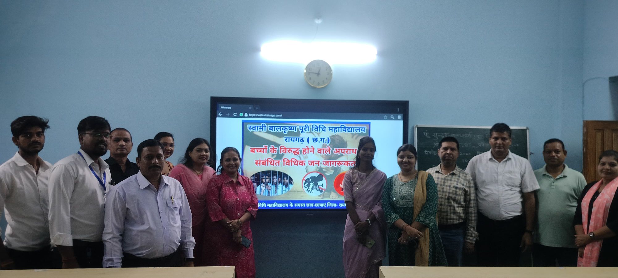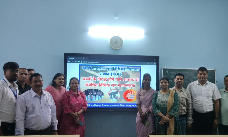 रायगढ़ – आज स्वामी बालकृष्ण पुरी विधि महाविद्यालय के प्रांगण में बच्चों के विरुद्ध होने वाले अपराधों से संबंधित विधिक जन जागरूकता हेतु व्याख्यान का आयोजन सुबह 10 बजे किया गया।