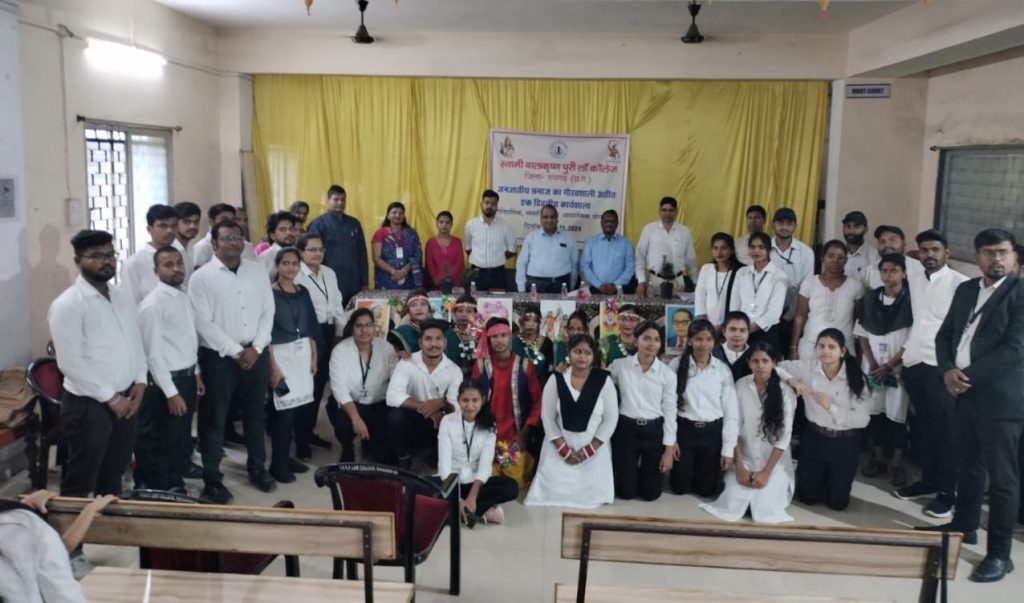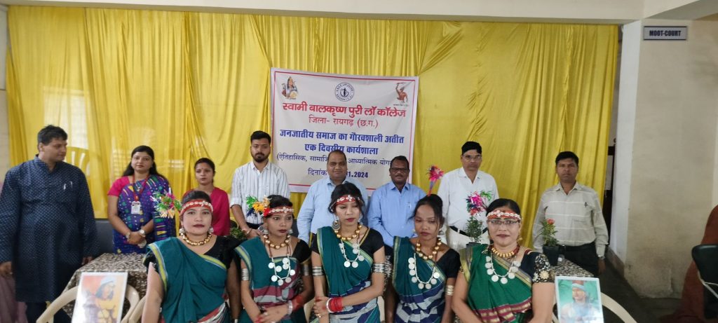 रायगढ़ – दिनांक 14-11-2024 को स्वामी बालकृष्ण पुरी विधि महाविद्यालय रायगढ़ में जनजातीय समाज का गौरवशाली अतीत नामक शीर्षक से एक दिवसीय कार्यशाला का आयोजन डॉ. • डी.के. मिश्रा, प्राचार्य की अध्यक्षता में किया गया। जिसमें मुख्य अतिथि के रूप में श्री रामजीत राम, जिला रोजगार अधिकारी, विशिष्ट अतिथि श्री राधेश्याम, सामाजिक कार्यकर्ता एवं मुख्य वक्ता अनिरूद्ध भट्ट पी. डब्ल्यू डी. रायगढ़ में पदस्थ एवं स्वामी बालकृष्ण पुरी विधि महाविद्यालय के अध्यक्ष श्री पुरूषोत्तम अग्रवाल एवं अन्य गणमान्य अतिथियों के आतिथ्य में संपन्न हुआ।