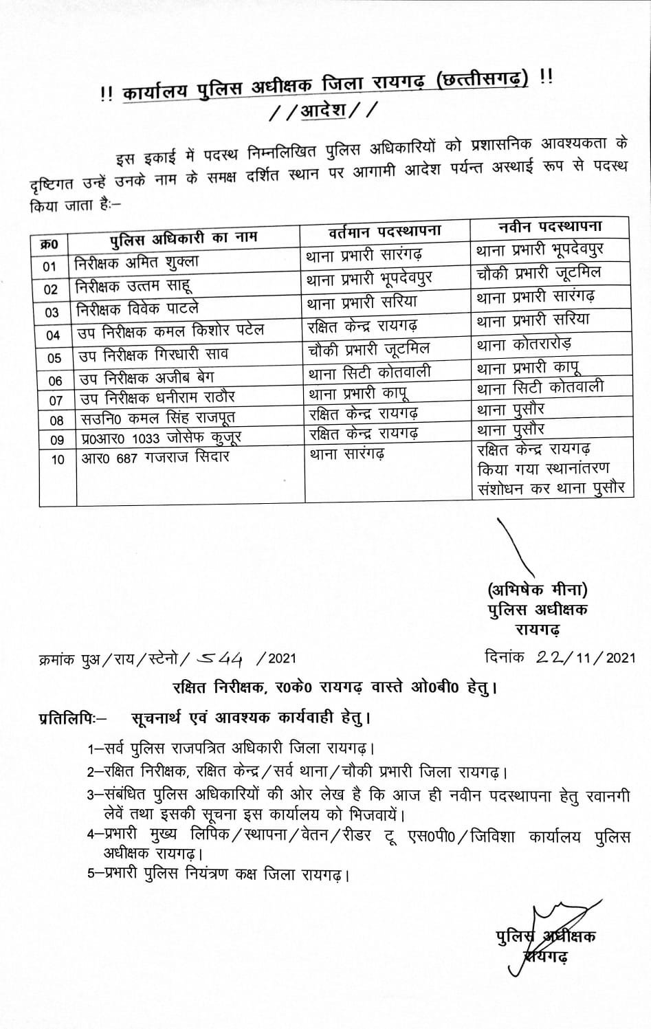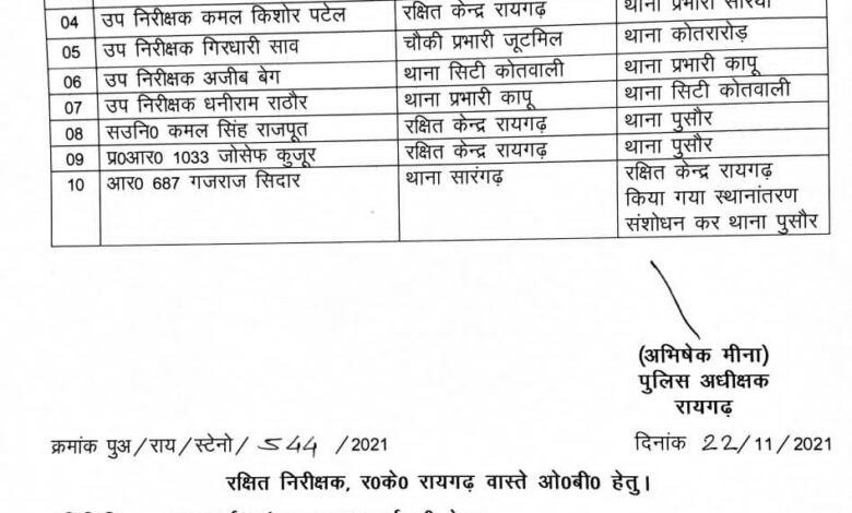 रायगढ़ एस.पी.अभिषेक मीणा ने किया पुलिस कर्मियों की फेर बदल, देखे लिस्ट।