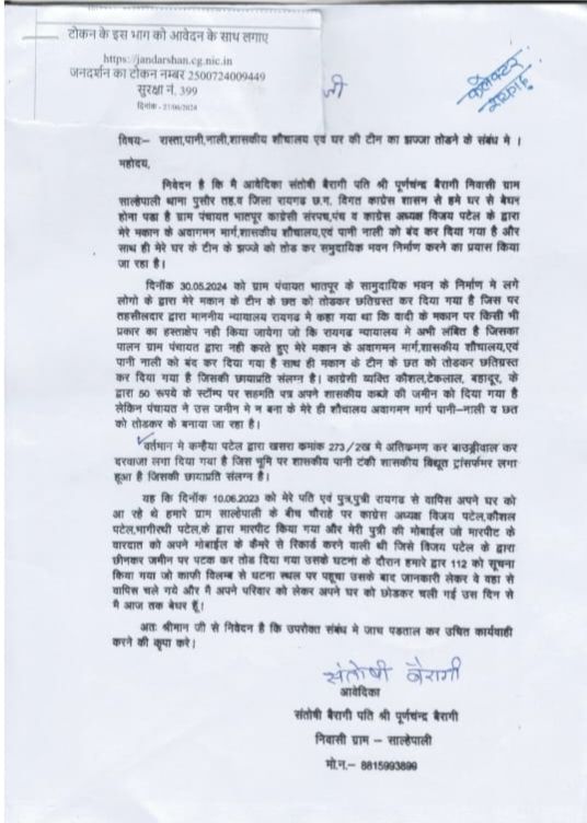 ज्ञात हो कि 21 मई 2024 को जनदर्शन दी गई शिकायत में उल्लेख है कि आवेदिका के मकान के अवागमन मार्ग, शासकीय शौचालय, एवं पानी नाली को बंद कर दिया गया है और साथ ही उनके घर के टीन के छज्जे को तोड़ने और कन्हैया पटेल द्वारा शासकीय भूमि खसरा क्रमांक 273/2/ख में अतिक्रमण कर बाउंड्रीवाल कर दरवाजा लगा दिया गया है जिस भूमि पर शासकीय पानी टंकी और शासकीय विद्युत ट्रांसर्फमर लगा हुआ है, उक्त सार्वजनिक भूमि पर अतिक्रमण कर लिया है। उन्होंने इन निर्माण कार्यों के नाम पर सरकारी संपत्ति पर कब्जा करने वालों के खिलाफ कार्रवाई की मांग की थी। लेकिन शासन-प्रशासन ने 13 महीने तक इस शिकायत को गंभीरता से नहीं लिया। इस बीच आज 21 जुलाई 2025 को पटवारी जांच के लिए गांव पहुंचा, परंतु नक्शा अधूरा होने के कारण मौके पर सीमांकन नहीं कर सका। पंचनामा में यह दर्ज किया गया कि भूमि विवाद के कारण जांच किसी अन्य पटवारी द्वारा कराई जानी चाहिए। पीड़िता का आरोप है कि यह केवल औपचारिकता निभाने जैसी कार्रवाई थी, जिससे अब न्याय की उम्मीद कमजोर पड़ रही है।