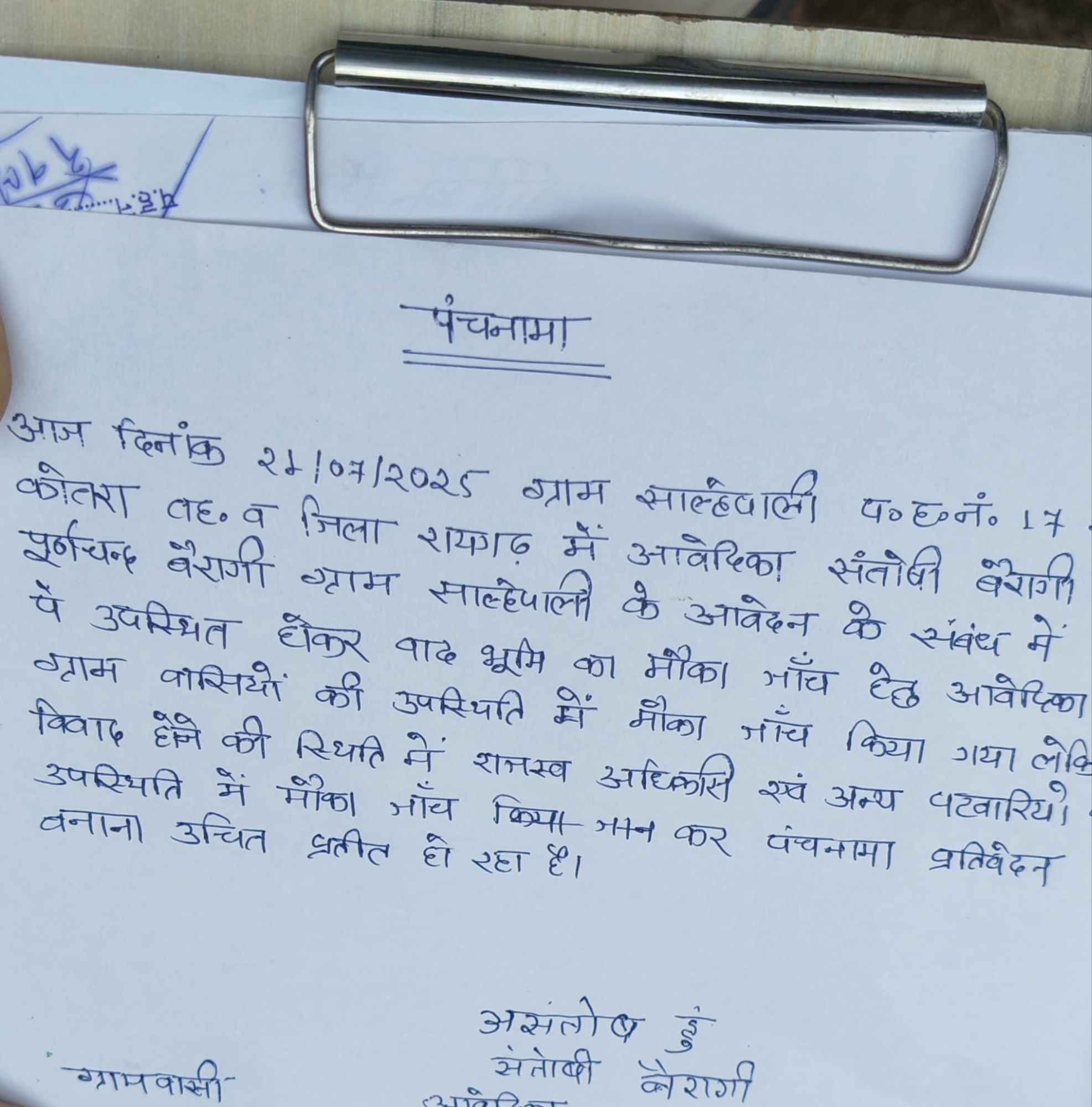रायगढ़। राजस्व और प्रशासनिक तंत्र की लापरवाही एक बार फिर उजागर हुई है। ग्राम साल्हेपाली निवासी संतोषी बैरागी ने बीते 21 मई 2024 को कलेक्टर जनदर्शन में शासकीय भूमि पर बाउंड्रीवाल कर दरवाजा लगाकर अतिक्रमण करने की लिखित शिकायत दर्ज कराई थी लेकिन आज 13 महीने बाद भी उन्हें न्याय नहीं मिला सका है। अब एक साल बाद शिकायत की जांच के लिए राजस्व विभाग से पटवारी तो भेजा गया मगर न तो नक्शा पूर्ण था, न ही ईमानदार मंशा। इसलिए पटवारी ने विवाद भूमि बात कर अपना पल्ला झड़ने हेतु पंचनामा बनाया है।