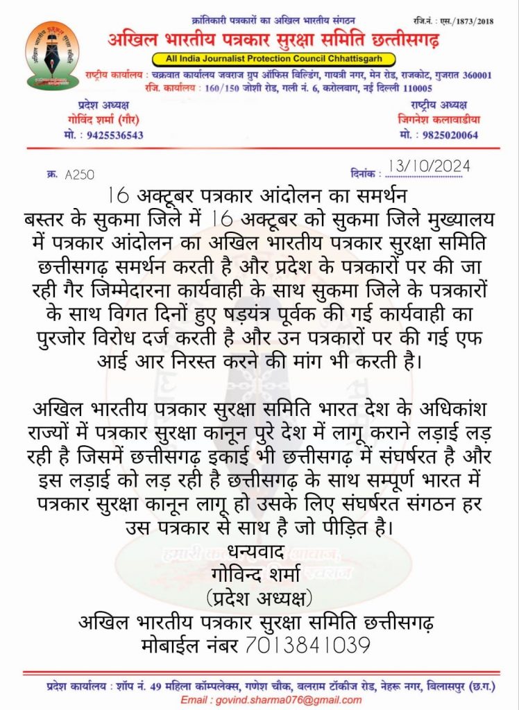 छत्तीसगढ़ में 16 अक्टूबर को पूरे पत्रकार आंदोलन अखिल भारतीय पत्रकार सुरक्षा समिति का भी पूर्ण समर्थन