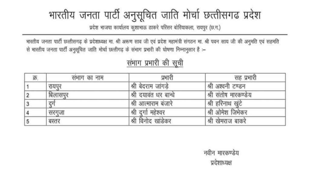 BREAKING NEWS: भाजपा ने किया अजा मोर्चा संभाग और ज़िला प्रभारियों की घोषणा,वेदराम जांगडे रायपुर संभाग, हरिनाथ खुंटे दुर्ग संभाग के सह प्रभारी बनाए गए, देखे लिस्ट