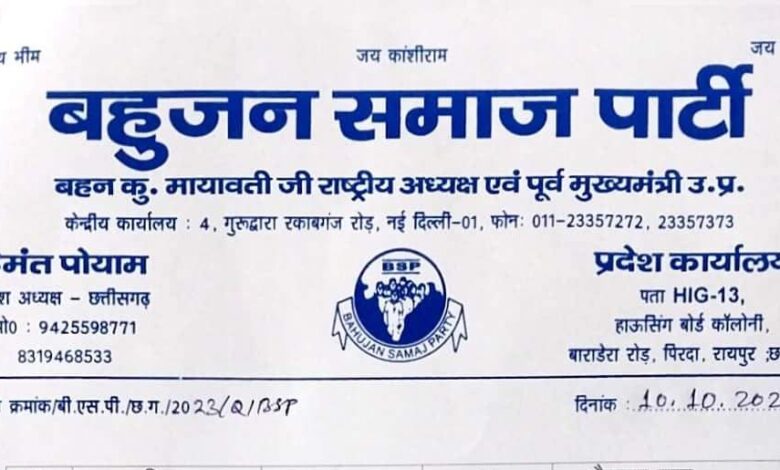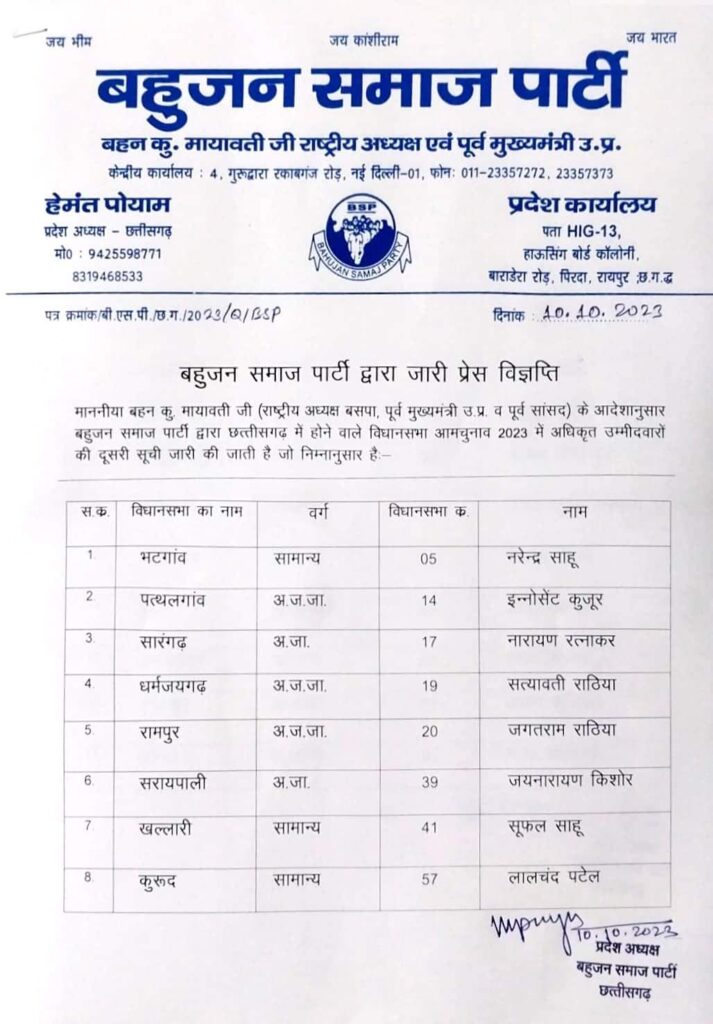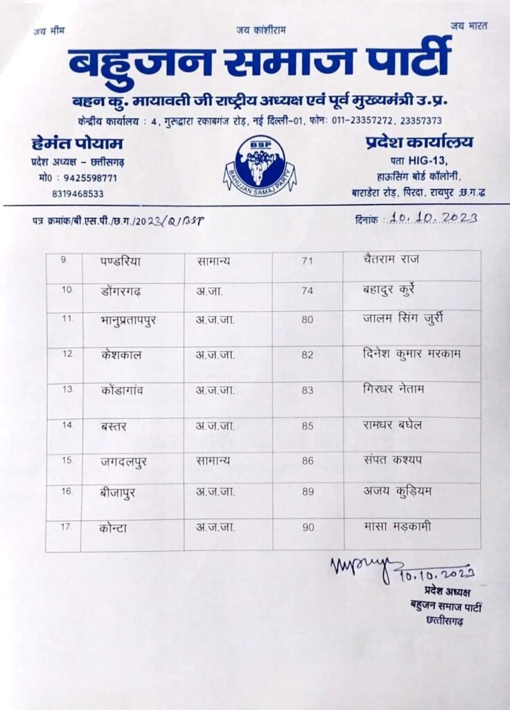 रायपुर - छत्तीसगढ़ बसपा विधानसभा चुनाव की लिस्ट हुआ जारी