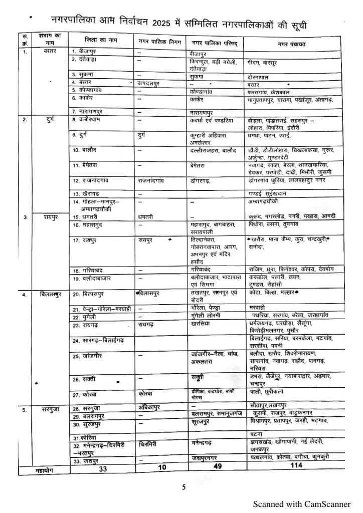 छत्तीसगढ़ में 10 नगर पालिका निगम, 49 नगर पालिका परिषद, 114 नगर पंचायत में होगा चुनाव होंगे। जिसमें जिला पंचायत के 433 सदस्य, जनपद पंचायत के 2973 सदस्य, 11672 ग्राम पंचायत और 160180 वार्ड पंच का भी निर्वाचन होगा।