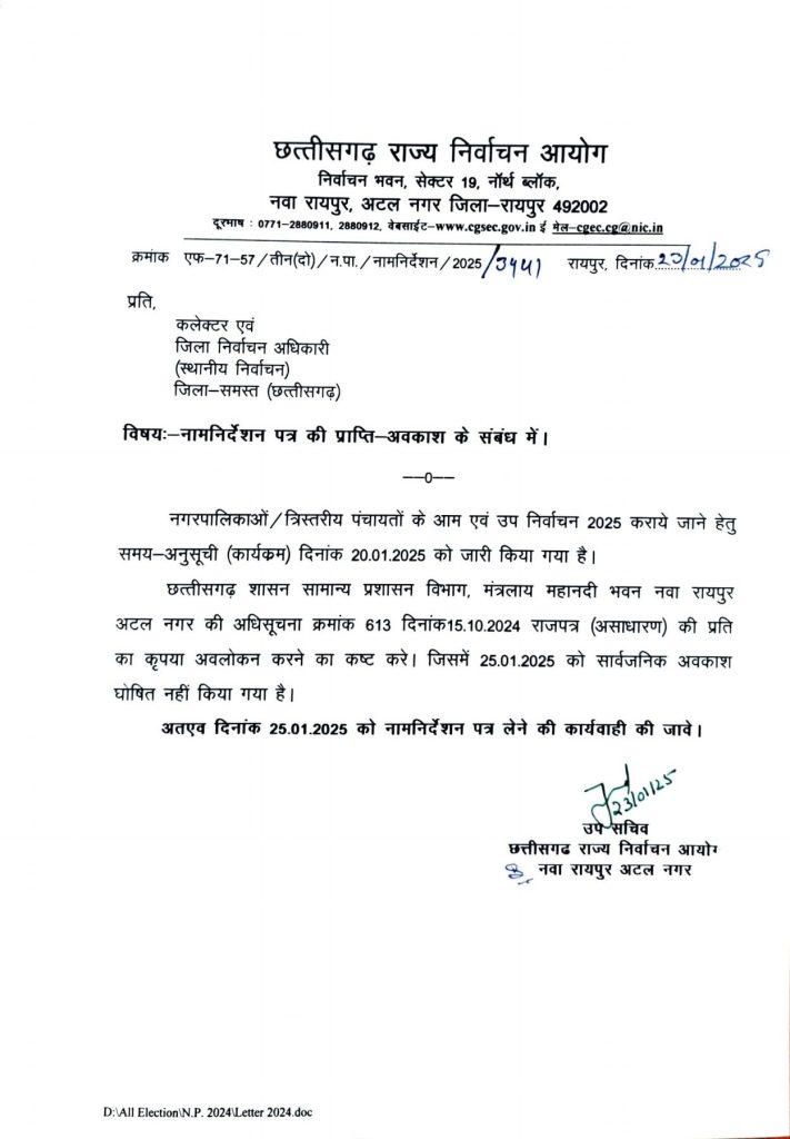 सारंगढ़ बिलाईगढ़, 24 जनवरी 2025/ छत्तीसगढ़ राज्य निर्वाचन आयोग ने राज्य के सभी कलेक्टर को पत्र जारी कर कहा है कि 25 जनवरी 2025 को सभी नगरीय निकायों (नगर पंचायतों) में नाम निर्देशन पत्र जमा करने की प्रक्रिया सामान्य रूप से की जाए। उल्लेखनीय है कि सामान्य प्रशासन विभाग मंत्रालय महानदी भवन नवा रायपुर की ओर से 25 जनवरी 2025 को कोई सार्वजनिक अवकाश घोषित नहीं किया गया है।