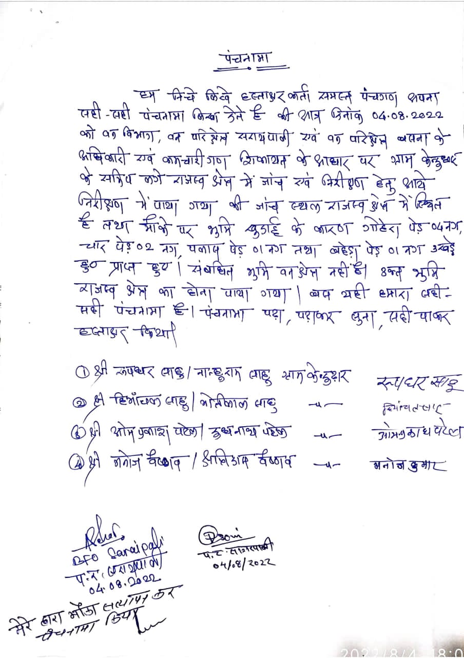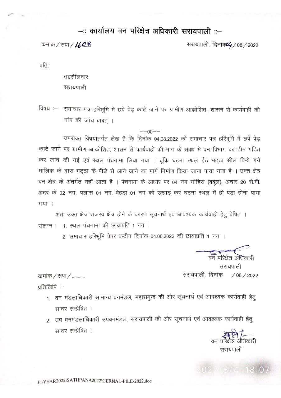 ग्राम केंदुढार में संचालित ईंट भट्ठा लक्ष्मी ब्रीक्स को प्रशासन के द्वारा सील किया गया है, लेकिन ईंट भट्ठा के संचालक ने सील किए जाने के बावजूद पीछे से एक वैकल्पिक मार्ग का निर्माण करवाया है, जिसके लिए कई पेड़ों को भी काटा गया है. इस संबंध में विगत दिनों हरिभूमि में समाचार का प्रकाशन किए जाने के बाद, वन विभाग वन परिक्षेत्र बसना व सरायपाली की टीम उक्त स्थल का निरीक्षण करने के लिए पहुंची हुई थी, जहां जांच के दौरान उन्होंने शिकायत को सही पाया. वैकल्पिक मार्ग को बनाने के लिए वहां 4 नग गोहिरा (बबूल), अचार 20 सेमी अंदर के 2 नग, पलास 1 नग, बेहड़ा 1 नग को बुखार आ गया है जो कि घटनास्थल पर ही पड़ा है. वन विभाग के द्वारा ग्रामीणों की उपस्थिति में पंचनामा बनाया गया एवं उक्त स्थान वन क्षेत्र का नहीं होने एवं राजस्व क्षेत्र का होने के कारण पंचनामा तहसीलदार को प्रेषित किया गया है.