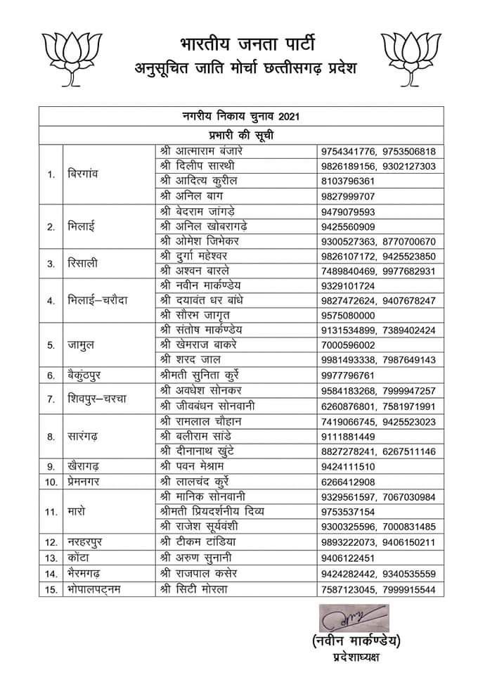 सारंगढ़:-आज प्रदेश अध्यक्ष श्री नवीन मार्कंडेय द्वारा छत्तीसगढ़ प्रदेश में होने वाले नगरी निकाय चुनाव के लिए प्रभारी की सूची जारी हुई