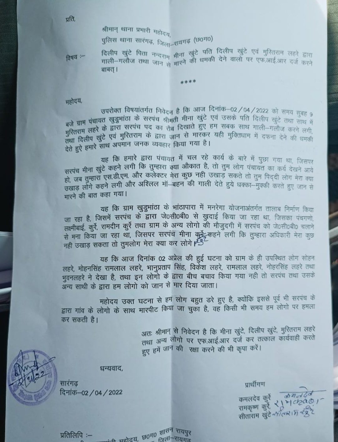 ज्ञात हो की इससे पूर्व ग्राम पंचायत खुडूभाठा के सरपंच द्वारा गर्भवती महिला दंडा दिखा कर मार पीट करने तथा गाली गलौज की शिकायत थाने में किया गया था जिस पर कोई कार्यवाही नहीं होने से सरपंच तथा उसके गुर्गों का मनोबल बढ़ा हुआ है।