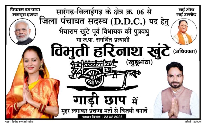 सारंगढ़ – त्रि स्तरीय पंचायत चुनाव में आज नाम वापसी का अन्तिम तारीख थी और प्रत्यासियों की छाप का दिन था आज जिला पंचायत की 14 सीटो में छाप आ चुका है वही क्षेत्र क्रमांक 06 के प्रत्यासी विभूति हरिनाथ खूंटे को गाड़ी छाप ( बैल गाड़ी) मिला है चुनाव चिन्ह आते ही प्रत्यासी ने क्षेत्र की जनता से अपिल की है की उनकी बेटी विभूति हरिनाथ खूंटे और चुनाव चिन्ह गाड़ी छाप को भरपूर सहयोग आशीर्वाद प्रदान करने की अपील की है और कहा की गाड़ी हमारी छत्तीसगढ़ीया संस्कृति से जुड़ा है किसान बैल गाड़ी से कृषि धान को ढोने का काम करते थे मैं भी जनता को यह विश्वास दिलाती हु की गाड़ी की ही तरह क्षेत्र की विकास को सदन से ढोते हुए गांव गांव पहुचाऊंगी