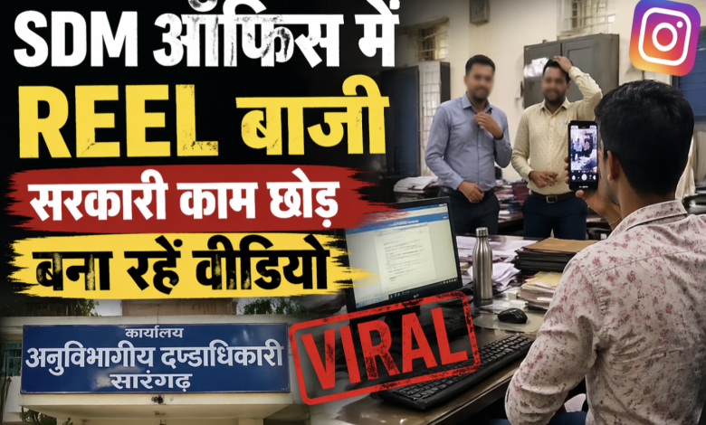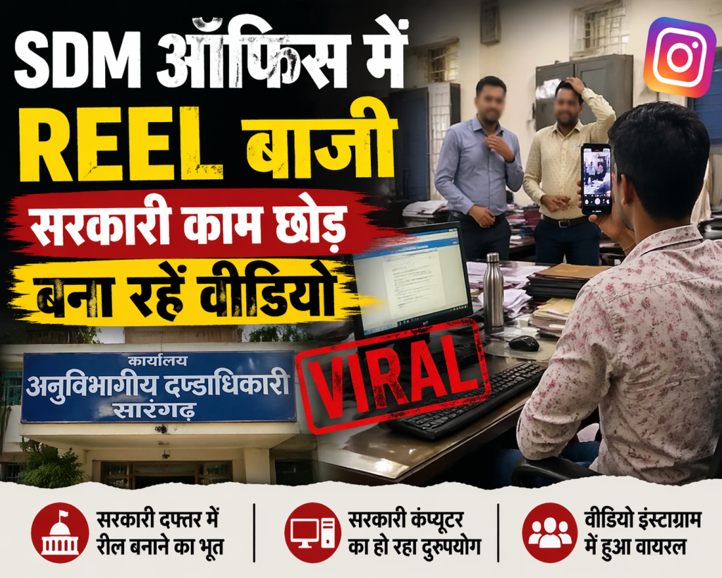 सारंगढ़-बिलाईगढ़। जिले के सारंगढ़ स्थित SDM कार्यालय से एक चौंकाने वाला मामला सामने आया है, जहां सहायक ग्रेड-2 और ग्रेड-3 के कर्मचारियों पर सरकारी दफ्तर में बैठकर रील बनाने का आरोप लगा है। बताया जा रहा है कि संबंधित बाबूओं ने सरकारी कंप्यूटर और कार्यालयीन समय का उपयोग कर सोशल मीडिया प्लेटफॉर्म Instagram के लिए वीडियो तैयार किया, जो अब तेजी से वायरल हो रहा है।