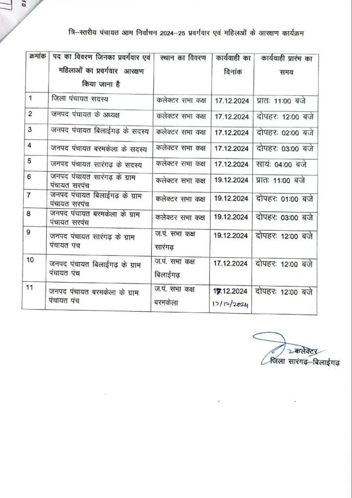 सारंगढ़ बिलाईगढ़ –  त्रिस्तरीय पंचायत आम निर्वाचन के आरक्षण हेतु आगामी कार्यक्रम की सूची।