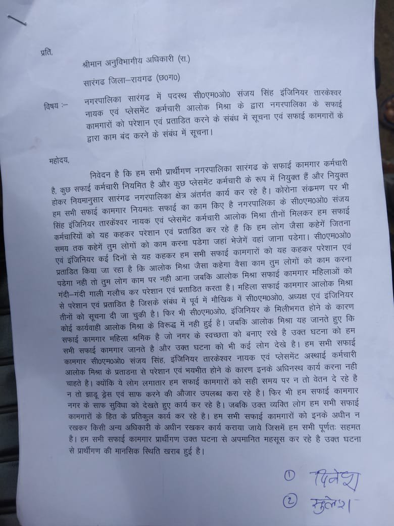 हम सभी सफाई कामगार नियमतः सफाई का काम किए है नगरपालिका के सी0एम0ओ0 संजय सिंह इंजिनियर तारकेश्वर नायक एवं प्लेसमेंट कर्मचारी आलोक मिश्रा तीनों मिलकर हम सफाई कर्मचारियों को यह कहकर परेशान एवं प्रताडित कर रहे हैं कि हम लोग जैसा कहेगें जितना समय तक कहेगें तुम लोगों को काम करना पड़ेगा जहां भेजेगें वहां जाना पडेगा। सी0एम0ओ0 एवं इंजिनियर कई दिनों से यह कहकर हम सभी सफाई कामगारों को यह कहकर परेशान एवं प्रताडित किया जा रहा है कि आलोक मिश्रा जैसा कहेगा वैसा काम तुम लोगों को काम करना पडेगा नही तो तुम लोग काम पर नहीं आना जबकि आलोक मिश्रा सफाई कामगार महिलाओं को गंदी-गंदी गाली गलौच कर परेशान एवं प्रताडित करता | महिला सफाई कामगार आलोक मिश्रा से परेशान एवं प्रताडित है जिसके संबंध में पूर्व में मौखिक में सी0एम0ओ0, अध्यक्ष एवं इंजिनियर तीनों को सूचना दी जा चुकी है। फिर भी सी0एम0ओ0, इंजिनियर के मिलीभगत होने के कारण कोई कार्यवाही आलोक मिश्रा के विरूद्ध में नही हुई है। जबकि आलोक मिश्रा यह जानते हुए कि