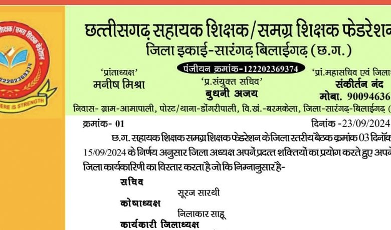 छत्तीसगढ़ सहायक शिक्षक समग्र शिक्षक फेडरेशन जिला सारंगढ़ बिलाईगढ़ जिलाध्यक्ष ने किया जिलाकार्यकारिणी का विस्तार