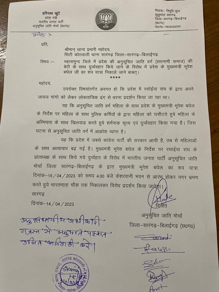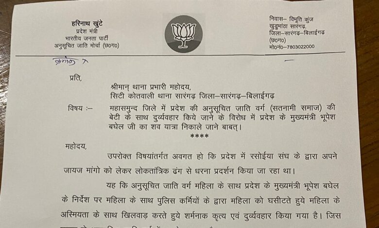 इस विषय में भाजपा अजा मोर्चा के प्रदेश मंत्री हरिनाथ खूंटे ने बताया कि अनुसूचित जाति वर्ग महिला के साथ प्रदेश के मुख्यमंत्री भूपेश बघेल के निर्देश पर महिला के साथ पुलिस कर्मियों के द्वारा महिला को घसीटते हुये महिला के अश्मिता के साथ खिलवाड़ करते हुये शर्मनाक कृत्य एवं दुर्व्यवहार किया गया है। जिस घटना से अनुसूचित जाति वर्ग में भारी आक्रोश व्याप्त है।