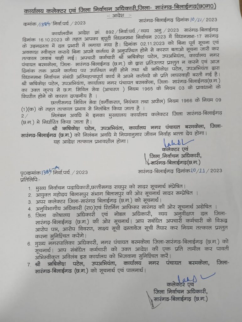 ऋषिकेश पटेल की ड्यूटी विधानसभा निर्वाचन के उड़न दस्ता टीम में दल प्रभारी बनाया गया था। श्री पटेल को 2 नवम्बर 2023 को बिना पूर्व सूचना एवं अवकाश स्वीकृत के अपने कर्तव्य में अनुपस्थित रहने के कारण नोटिस दिया गया था। नोटिस का जवाब नही देने और 10 नवम्बर 2023 तक अपने कर्तव्य में अनुपस्थित पाए जाने के कारण उन्हें सस्पेंड किया गया है। नियम अनुसार उन्हें जीवन निर्वाह भत्ता दिया जाएगा। निलंबन अवधि में श्री पटेल का मुख्यालय कलेक्टोरेट कार्यालय सारंगढ़ होगा।