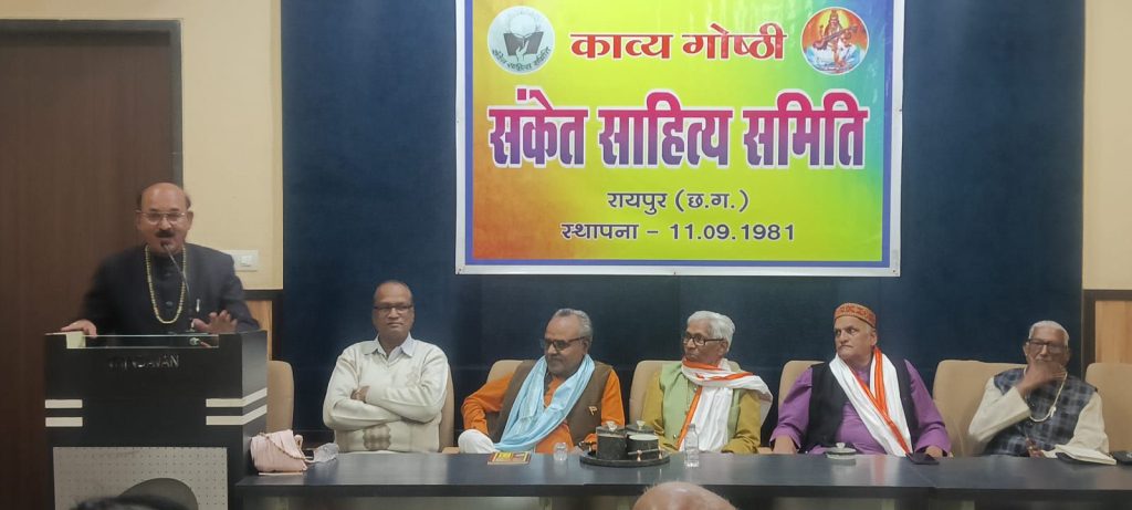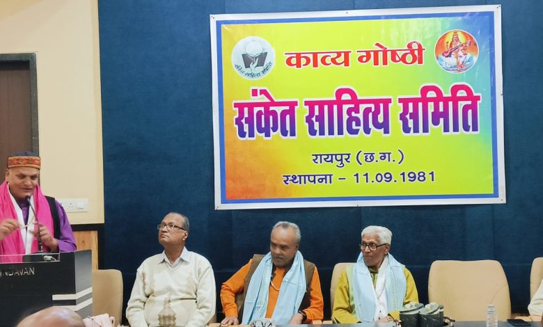 रायपुर ।वृंदावन हॉल रायपुर में दिनांक 20 जनवरी को भाषाविद् एवं वरिष्ठ साहित्यकार डॉ. चितरंजन कर की अध्यक्षता एवं लब्धप्रतिष्ठ व्यंग्यकार गिरीश पंकज, मीर अली मीर एवं सुरेंद्र रावल के विशिष्ट आतिथ्य में संकेत साहित्य समिति के तत्वावधान में नववर्ष सरस काव्य गोष्ठी का आयोजन किया गया।कार्यक्रम के आरंभ में माँ सरस्वती की पूजा अर्चना के पश्चात समिति द्वारा एवं कवि छबिलाल सोनी द्वारा अतिथियों ,विजय मिश्रा अमित एवं लक्ष्मी नारायण लहोटी का अंगवस्त्र, मोतियों की माला एवं श्रीफल से सम्मान किया गया। संकेत साहित्य समिति के संस्थापक एवं प्रांतीय अध्यक्ष डॉ माणिक विश्वकर्मा ‘नवरंग’ ने स्वागत उद्बोधन में संमिति की दीर्घकालीन साहित्यिक यात्रा पर प्रकाश डालते हुए कहा कि कोई भी साहित्य समिति कवियों एवं कवयित्रियों के लिए बौद्धिक विकास एवं रचनात्मक विकास की कार्यशाला होती हैं। डॉ.चितरंजन कर ने कहा कि सीखने की कोई उम्र नहीं होती । जो सीखना बंद कर देता है , जो व्यक्त कर देता है वह व्यक्त नहीं कर पाता। गिरीश पंकज ने कहा कि काव्य गोष्ठियों से नये सृजन को बल मिलता है।  साहित्यिक वातावरण च़ितन के लिए मस्तिष्क की उर्वरता को बढ़ाता है। सुरेन्द्र रावल ने विभिन्न प्रकार के लोगों को खूबसूरती से रेखांकित किया। सुपरिचित कवयित्री पल्लवी झा के सफल संचालन में जिन कवियों एवं कवयित्रियों ने काव्य पाठ किया उनमें – डॉ.चितरंजन कर , गिरीश पंकज , डॉ. माणिक विश्वकर्मा ‘नवरंग’, डॉ.सुधीर शर्मा, मीर अली मीर, सुरेन्द्र रावल,महेश कुमार शर्मा,डॉ.सिद्धार्थ कुमार श्रीवास्तव, डॉ.दीनदयाल साहू, पल्लवी झा,सुषमा पटेल,पूर्वा श्रीवास्तव, शकुंतला तरार, गोपाल जी सोलंकी, छबिलाल सोनी, राजेश अग्रवाल, डॉ.रविन्द्र सरकार, हरीश कोटक, माधुरी कर, रीना अधिकारी, दिलीप वरवंडकर, शिवशंकर गुप्ता,मन्नु लाल यदु , लवकुश तिवारी, यशवंत यदु , देवाशीष अधिकारी, चेतन भारती, बानीब्रत अधिकारी, राजकुमार सोनी, अर्चना श्रीवास्तव,रामचंद्र श्रीवास्तव, राजेन्द्र रायपुरी, रूपाली चक्रवर्ती, विवेक रहाटगाँवकर , समायरा पटेल, ज्योति रहाटगाँवकर,नितेश ठाकुर ‘नीर , लालजी साहू,कुमार जगदली, गोपाल सोलंकी, अंबर शुक्ला ‘अंबरीश’,राजेन्द्र ओझा,एकता शर्मा, अनीता झा,राकेश अग्रवाल, विपुल तिवारी, आशा पाठक, नीलिमा मिश्रा, माधुरी कर , कल्याणी तिवारी, एवं गणेश दत्त झा के नाम प्रमुख हैं। नववर्ष के उपलक्ष्य में नयी चेतना, नयी परिकल्पना एवं नयी विचारधाराओं से संबंधित पढ़ी गईं रचनाओं के प्रमुख अंश निम्नानुसार हैं-