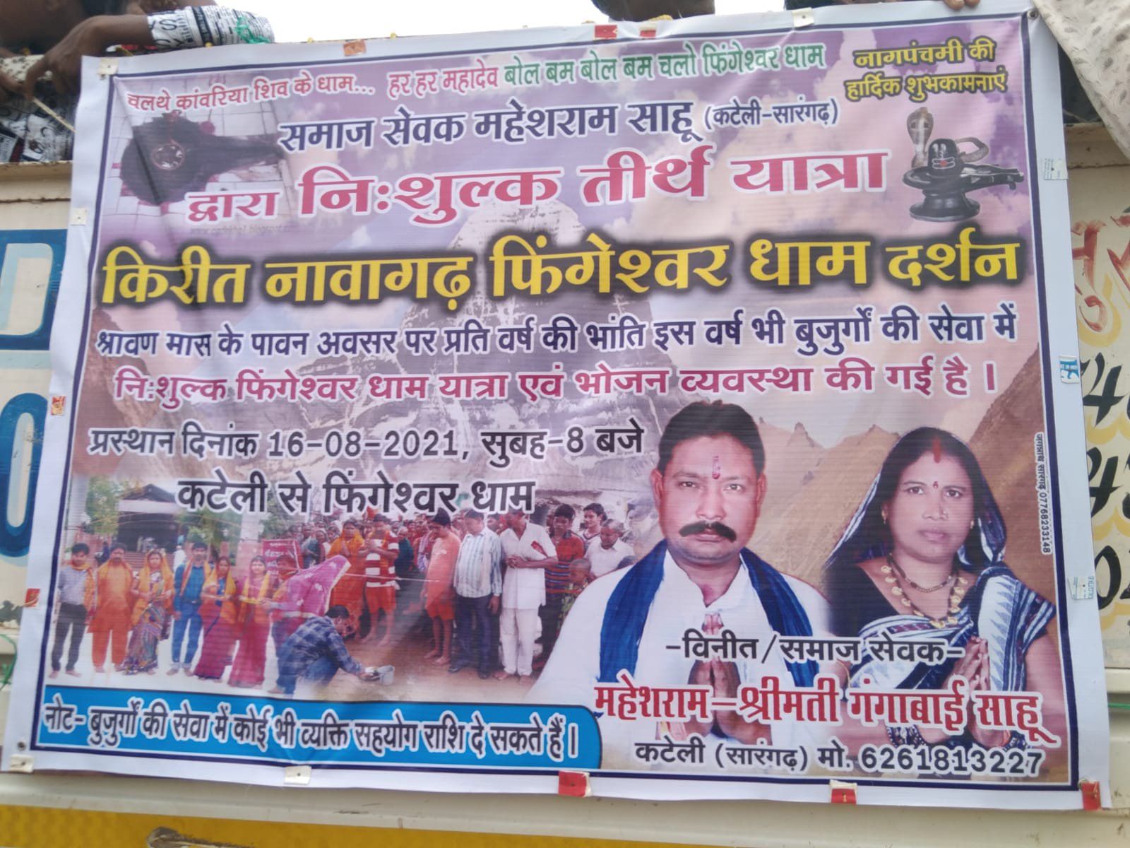 सारंगढ़/कटेली:-विकासखंड सारंगढ़ के अंतर्गत ग्राम पंचायत कटेली एक दिवसीय मेला एवं प्रवचन में बुजुर्गों के लिए निशुल्क यात्रा किरीत फिगेशवरधाम नावागढ यात्रा एवं निशुल्क भोजन व्यवस्था समाज सेवक महेशराम साहू कटेली के द्वारा यह आयोजन रखा गया है