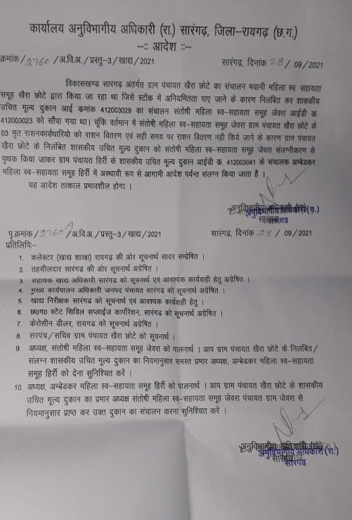 और सभी अनिमितताओं को देख कर उक्त शासकीय उचित मूल्य की दुकान को अम्बेडकर महिला स्व.सहायता समूह हिर्री में संलग्न किया गया है।