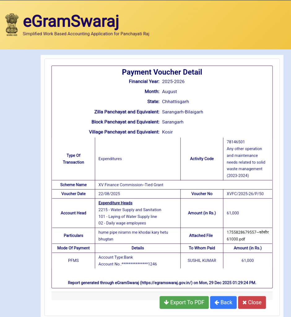 हम बात कर रहें हैं सारंगढ़ जनपद पंचायत के अंतर्गत आने वाले ग्राम पंचायत कोसीर क़ी,जहां 15वें वित्त योजना की राशि का दुरुपयोग किया गया, जो कि एक गंभीर अपराध है। सरपंच और सचिव ने मिलीभगत कर फर्जी बिल लगाकर सरकारी राशि गबन किया, जो कि ग्रामीणों के विकास के लिए आवंटित राशि का दुरुपयोग है।