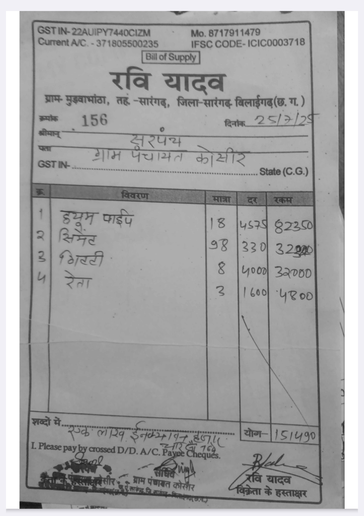 अगर ग्राम पंचायत में बिना GST बिल का राशि आहारण किया गया है, तो ये साफ जाहिर है कि विकास कार्य प्रभावित हुआ है और शायद सामग्री की खरीद ही नहीं हुई है। दुकान से सामग्री ली जाती, तो पक्का बिल मिलता। ये फर्जी बिलों का खेल सिर्फ सरकारी धन का गबन है।
