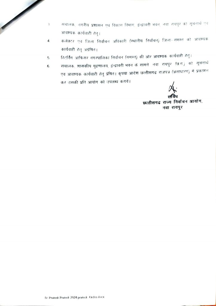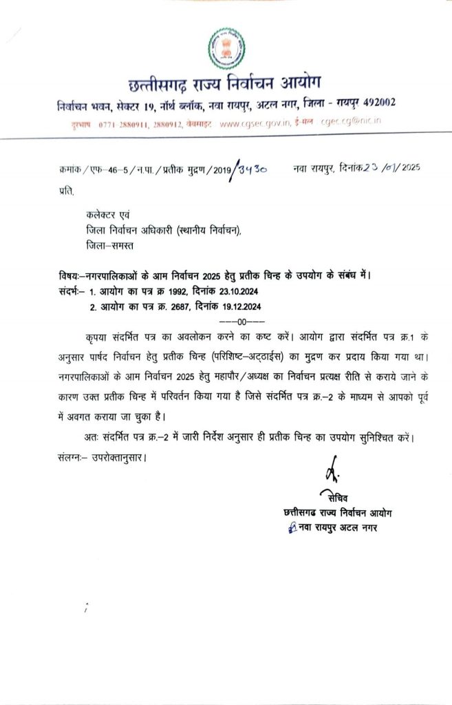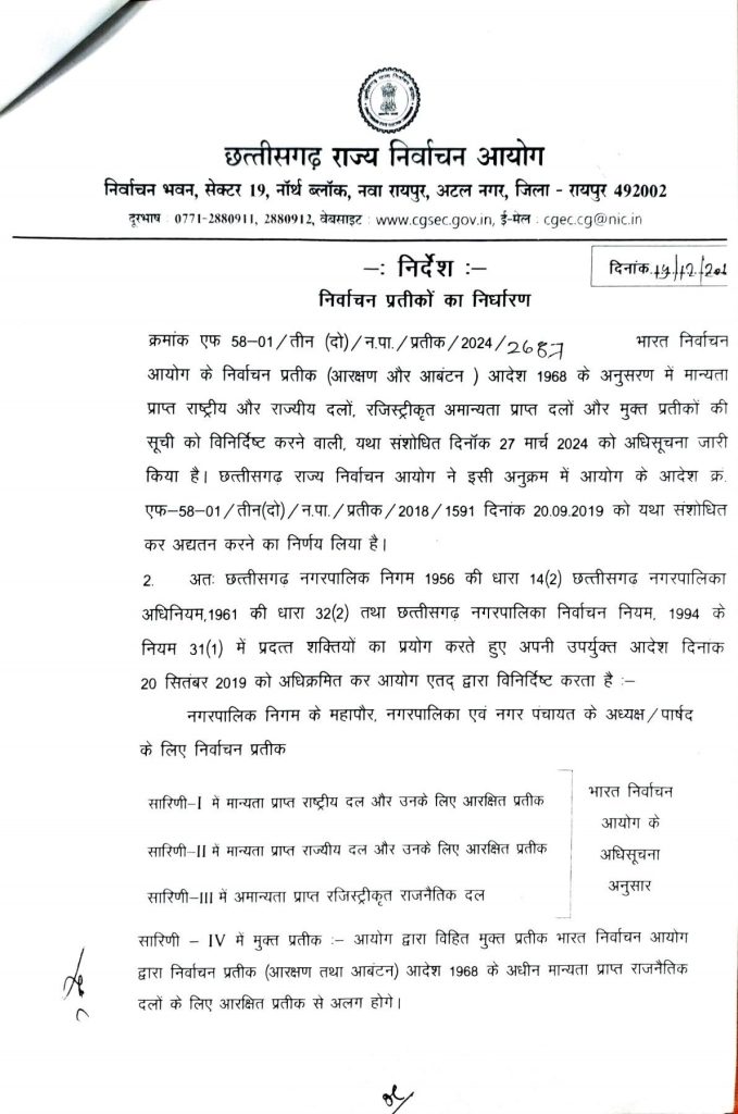 सारंगढ़ बिलाईगढ़, 24 जनवरी 2025/ नगरपालिका आम निर्वाचन 2025 के लिए छत्तीसगढ़ राज्य निर्वाचन आयोग ने राज्य के सभी कलेक्टर को सभी नगरीय निकायों में पार्षद सहित नगरपालिक निगम में महापौर, नगरपालिका और नगर पंचायत में अध्यक्ष पद हेतु नाम निर्देशन पत्र में प्रतीक चिन्ह के उपयोग के लिए पत्र जारी किया है। इसके अनुसार मान्यता प्राप्त राष्ट्रीय, राज्यीय और अमान्यता प्राप्त रजिस्ट्रीकृत राजनैतिक दल के लिए आरक्षित प्रतीक चिन्ह से अलग प्रतीक चिन्ह की सूची जारी किया है।