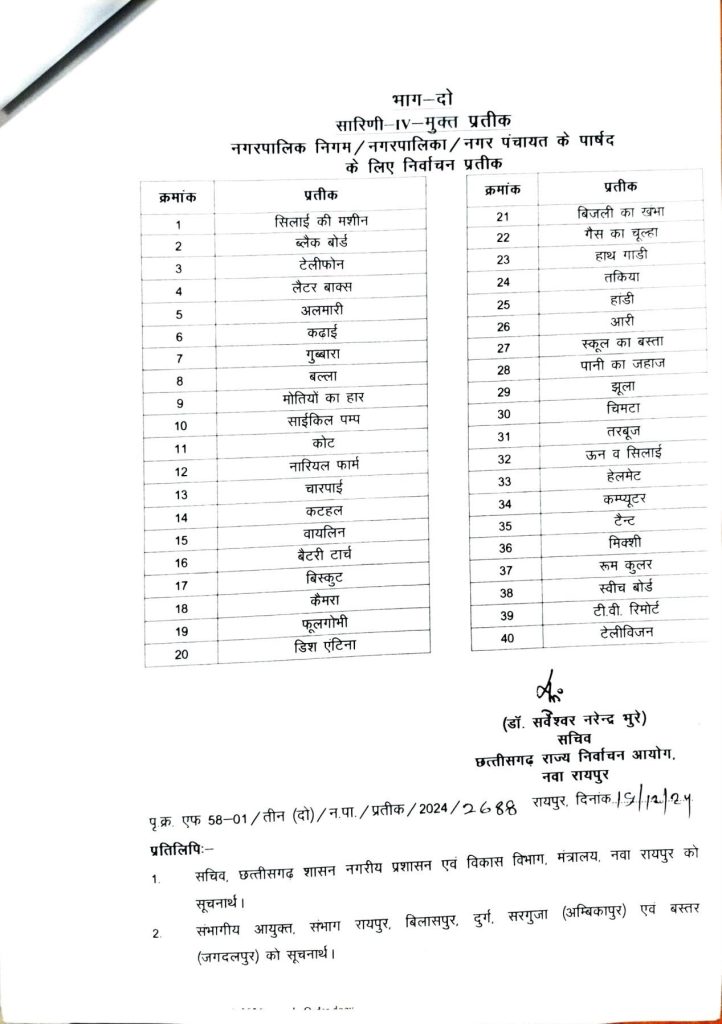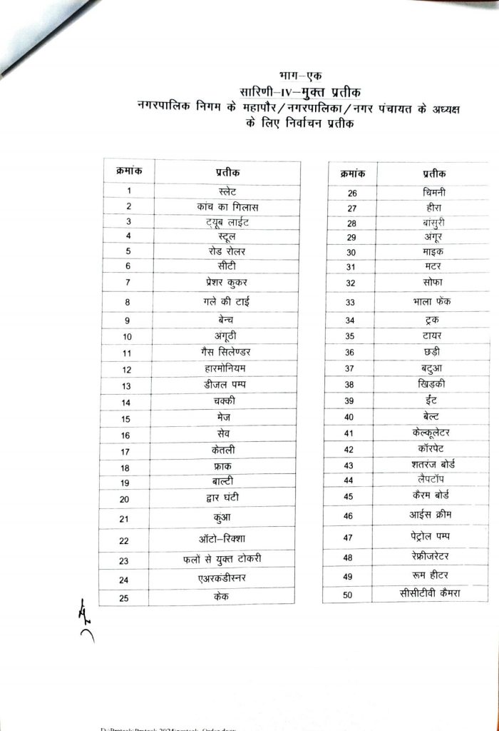 नगरीय निकायों के महापौर,अध्यक्ष और पार्षद पद हेतु मुक्त प्रतीक चिन्ह, देखें लिस्ट।
