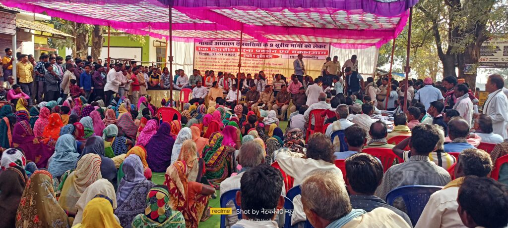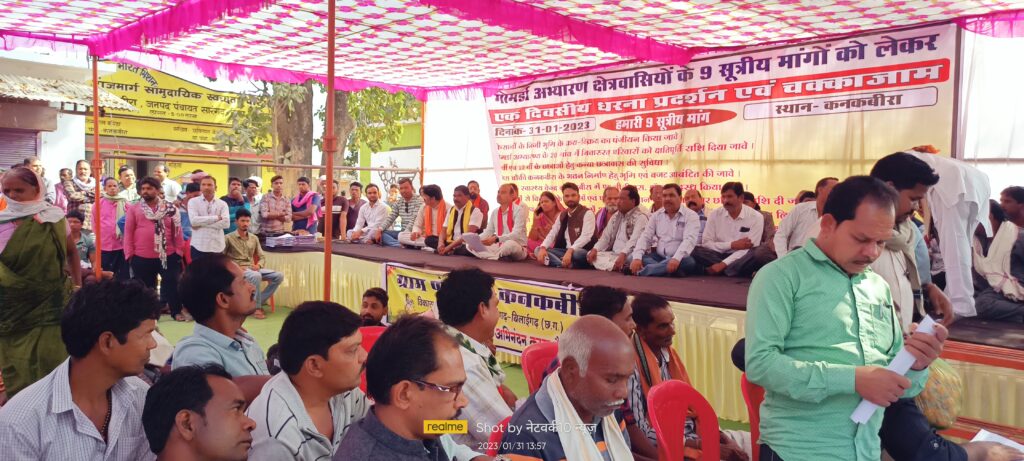 गोमर्डा अभ्यारण क्षेत्र के किसानों एवं गरीब परिवारों के हित में नौ सूत्रीय मांगों को लेकर आज सारंगढ़ कनकबिरा धरना प्रदर्शन कर एवं नेशनल सड़क में किया गया चक्का जाम।