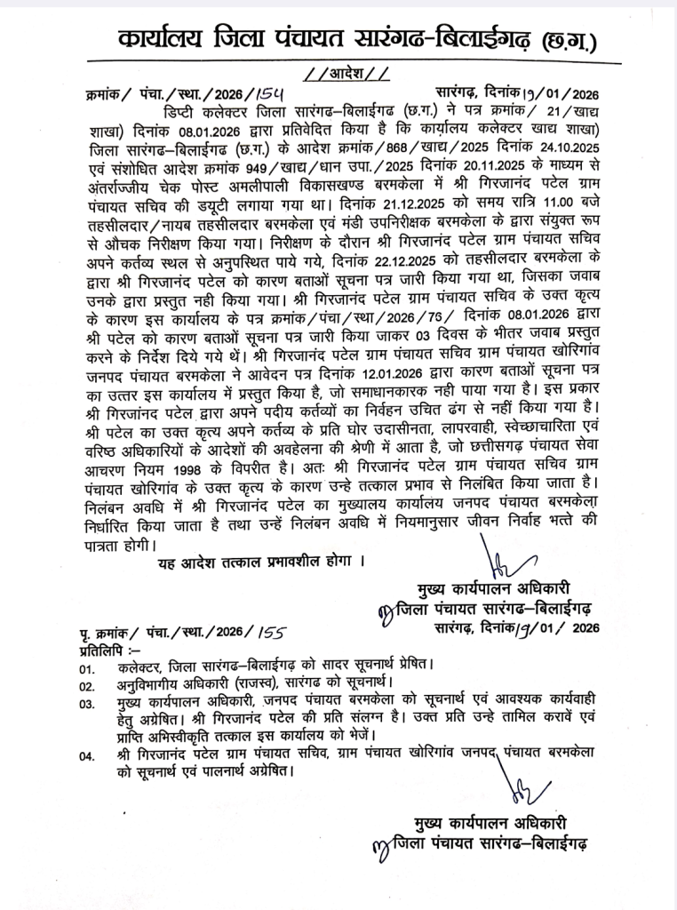 सारंगढ -बिलाईगढ़, 19 जनवरी 2026/अवैध धान परिवहन पर रोकथाम के लिए अंतर्राज्जीय चेक पोस्ट अमलीपाली विकासखण्ड बरमकेला में गिरजानंद पटेल ग्राम पंचायत सचिव की डयूटी लगाया गया था, जिसमें लापरवाही कर्मचारी को  भारी पड़ गया। कलेक्टर डॉ संजय कन्नौजे के निर्देश पर सीईओ बर्मन ने सस्पेंड आर्डर जारी किया है।