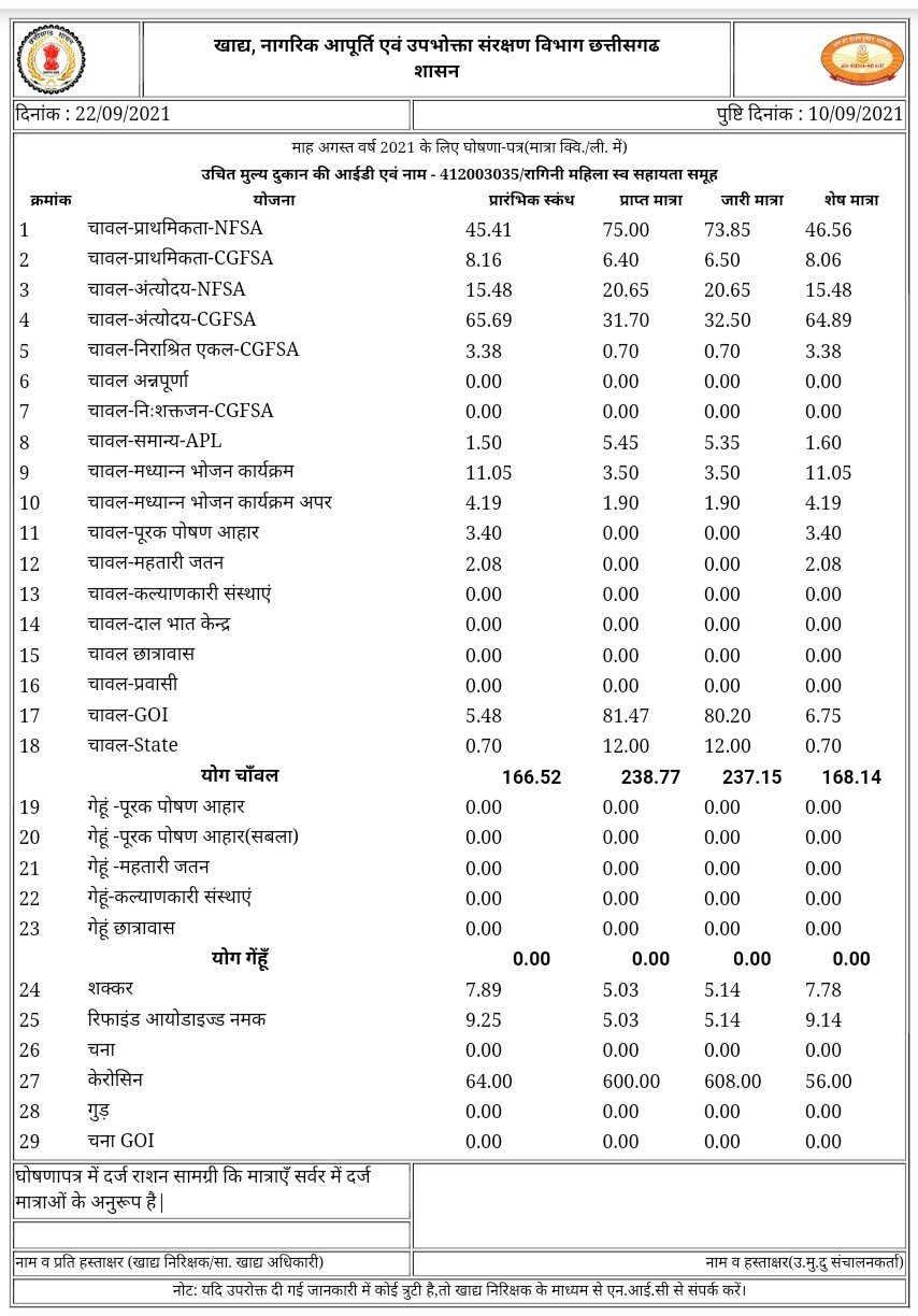ये तो रही बात चावल की ,यहाँ तक कि इस समूह द्वारा बारदाना में कई मुनाफा कमाने की मंशा से 48.25% 1421शेष बरदाना में घोटाला किया गया है। अगर शासन इस समूह से वसूली करता है तो 550000 अनुमानित राशि का वसूली किया जा सकता है। रागनी महिला स्व.सहायता समूह शासकीय उचित मूल्य की दुकान/संचालन कर्ता शिव अनंत शासन की राशि को खा कर बैठ गया है?