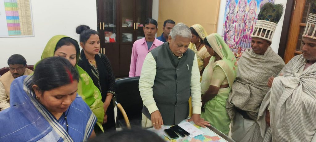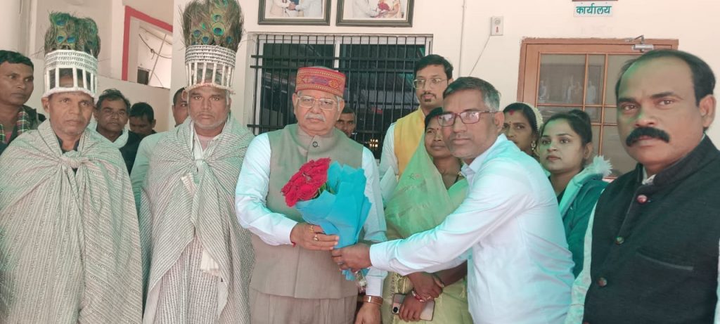 सारंगढ़। दिनांक 20 दिसम्बर को भाजपा नेत्री व सारंगढ़ विधानसभा चुनाव में प्रत्याशी रही शिवकुमारी सारधन चौहान के नेतृत्व में रामनामी समाज ने मुख्यमंत्री विष्णुदेव साय से मुलाकात कर आगामी 21 जनवरी को लेन्ध्रा में होने वाले भजन मेले में शामिल होने हेतु निमंत्रण पत्र सौंपा। इस दौरान भाजपा के कई कार्यकर्ता शिवकुमारी के साथ रहे तो वहीं रामनामी समाज के गुरू भी मुख्यमंत्री को आमंत्रित करने पहुचे। समाज के गुरुओं को देखकर मुख्यमंत्री ने उनसे आर्शीवाद भी लिया।