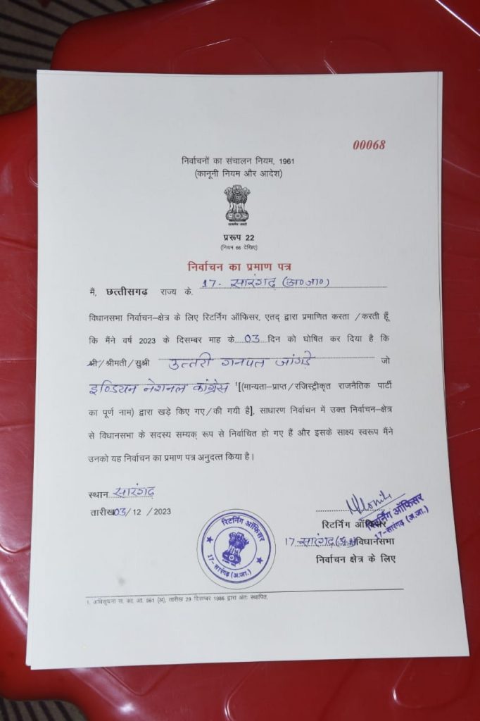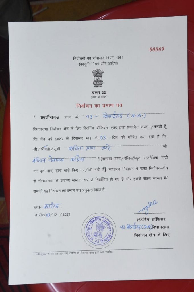 सारंगढ़ और बिलाईगढ़ विधानसभा के विजयी उम्मीदवारों को प्रमाण पत्र रिटर्निंग अधिकारियो ने प्रदान किया.