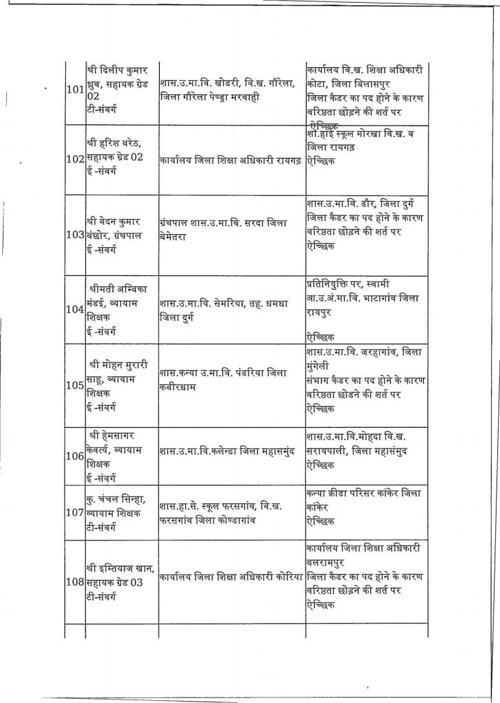 सारंगढ़ बिलाईगढ़:- राज्य शासन, द्वारा,अधिकारियों/कर्मचारियों को स्थानांतरित करते हुए उनके नाम के सम्मुख दर्शित कॉलम नंबर 4 में अस्थायी रूप से आगामी आदेश पर्यन्त तक पदस्थ किया है। जिसमें सारंगढ़ बिलाईगढ़ जिले में जिला शिक्षा अधिकारी,जोइधाराम डहरिया क़ो पदस्थ किया गया है।