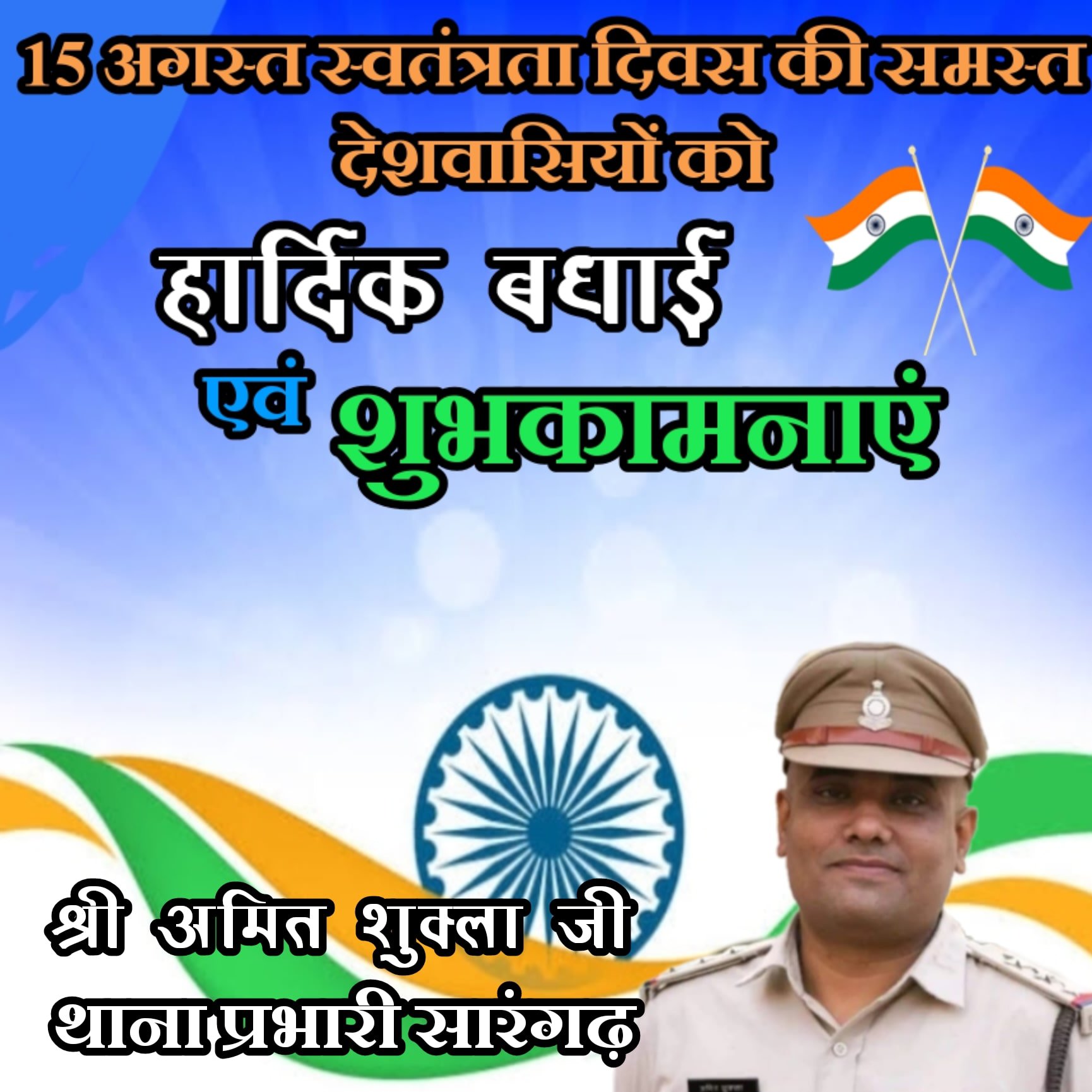 थाना प्रभारी अमित शुक्ला:मेरे सभी देशवासियों को 75वाँ स्वतंत्रता दिवस की हार्दिक बधाई,शुभकामनाएं।