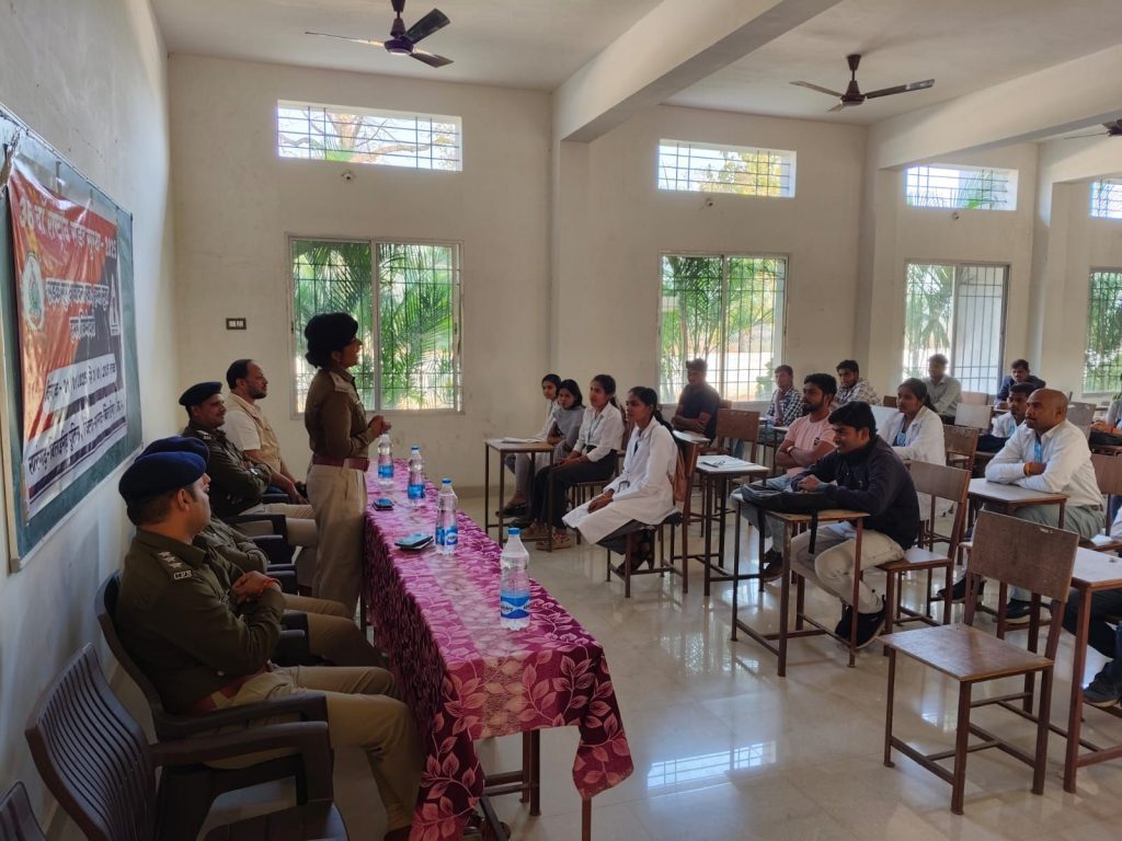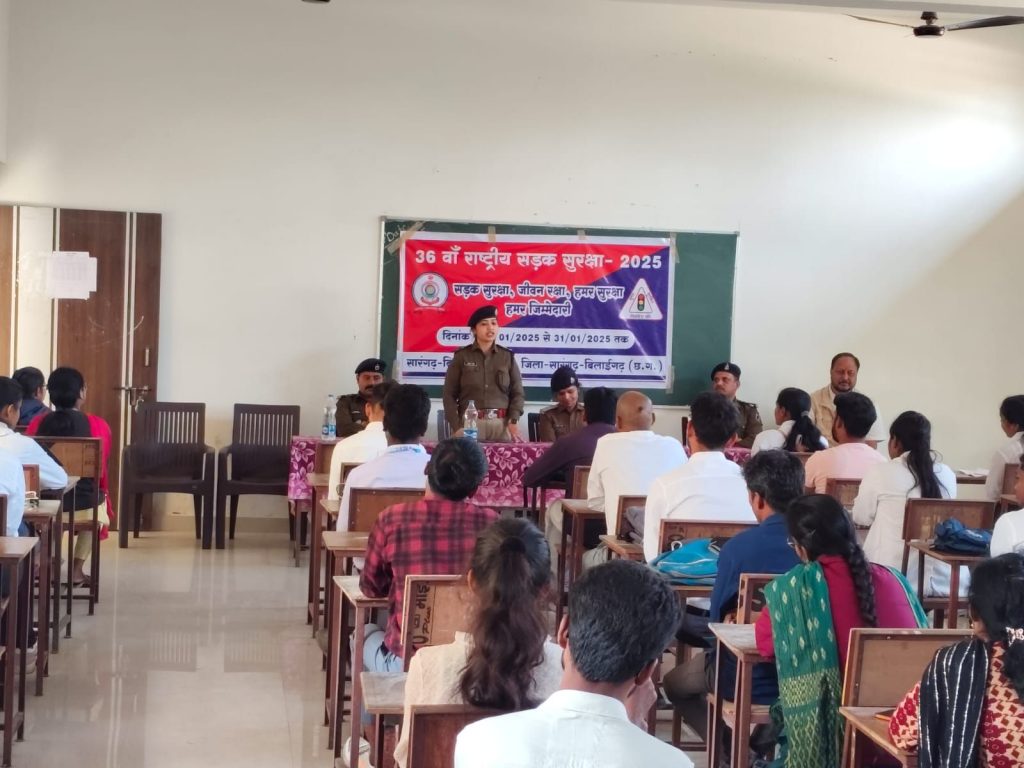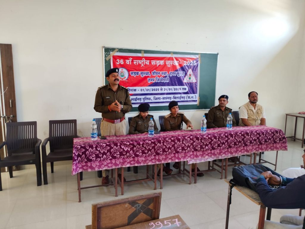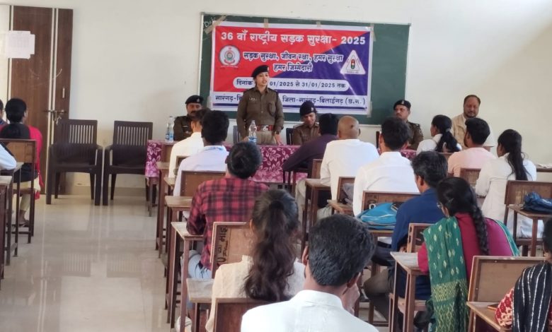 सारंगढ़ बिलाईगढ़ – पुलिस अधीक्षक श्री पुष्कर शर्मा के मार्गदर्शन मे अति0 पुलिस अधीक्षक श्रीमती निमिषा पाण्डेय एवं एसडीओपी श्रीमति स्नेहिल साहू व एसडीओपी अविनाश मिश्रा के द्वारा 36वा राष्ट्रीय सड़क सुरक्षा माह- 2025 का शुभारम्भ सीपीएम कॉलेज के विद्यार्थीयों को सड़क सुरक्षा नियम के प्रति जागरूक करते हुए किया गया। जिसमे यातायात नियमों के सम्बंध मे जानकरी दी गई और यातायात के नियमो का पालन करने सभी को प्रतिबद्ध किया गया तथा राष्ट्रीय सड़क सुरक्षा माह- 2025 के तहत जनवरी माह मे विभिन्न माध्यमो से लोगो को यातायात नियमो के प्रति जागरूक करने विभिन्न कार्यक्रमों का आयोजन सभी थाना स्तर पर किया जायेगा।