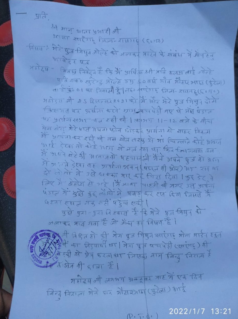 सारंगढ़ नगरपालिका मौहारभाठा व ग्राम पचपेड़ी की है मामला, मिथुन की माँ ने सारंगढ थाने में लगाई गुहार, कहा मेरे बेटे को जलाकर मारा गया …. मिथुन की हत्या हुई या आत्महत्या ? … प्रेम प्रसंग का है मामला?