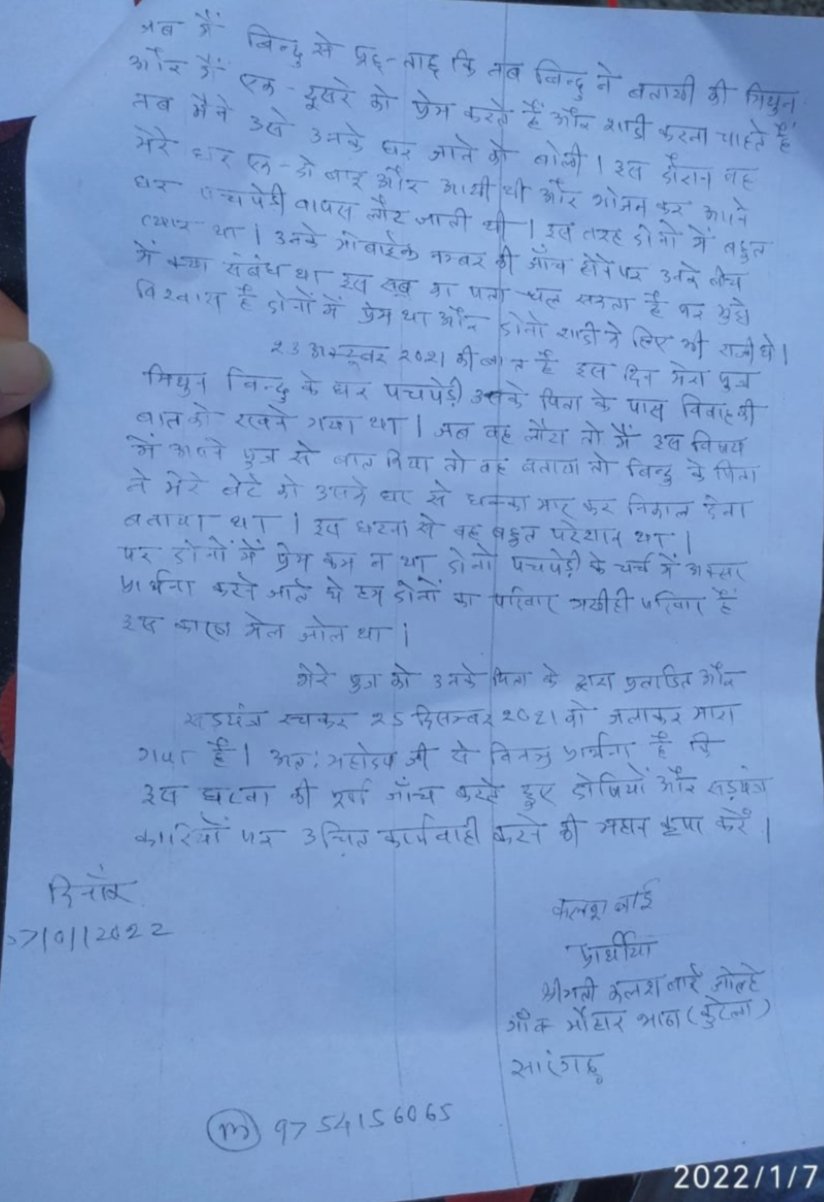 क्या है पुरा मामलामिथुन की माँ अपने बेटे के अंतरंग के बारे में अपने आवेदन में सारंगढ पुलिस के समक्ष बात रखी है जिसमें कहा गया है कि मेरा बेटा अभी सारंगढ में पढ़ाई कर रहा था वह ग्राम पचपेड़ी के युवती रागनी (परिवर्तित नाम ) प्रेम करता था दोनों में बहुत प्यार था रागनी कॉलेज में पढ़ती है वह एक दिन हमारे घर अक्टूबर में आयी तब उससे पूछ -ताछ की तब वह बताई मैं मिथुन से प्यार करती हूं शादी करना चाहते हैं तब मैंने उसे उसके घर जाने को कही ।उस दिन से वह कई बार हमारे घर में आई थी खाना खाकर जाती थी ।मेरे बेटे और रागनी में बहुत प्रेम था दोनों शादी करना चाहते थे ।23 अक्टूबर 2021 की बात है इस दिन मेरा पुत्र मिथुन रागनी के घर पचपेड़ी गया और विवाह की बात रखा पर जब रागनी के घर से लौटा तो मैंने अपने पुत्र से पूछा तब वह बताया कि उसके पिता ने धक्के मार कर निकाल दिया था ।इस घटना से वह बहुत परेशान था ।पर दोनों में बहुत प्रेम था ।वह अक्सर उसे पचपेड़ी बुलाती थी और वहाँ के चर्च में प्रार्थना में भेंट होते थे ।इस तरह अपने आवेदन में बात रखी है वही रागनी के पिता पर प्रताड़ित करने और जलाकर मारने की आरोप लगाई है और सडयंत्र कारियों पर उचित कार्यवाही की मांग की है वही उनके मोबाईल की जांच की मांग भी किया गया है ।आखिर दोनो में इतना प्रेम था तो ऐसा क्या हुआ कि मिथुन को आत्मा हत्या करना पड़ा या उसकी हत्या हो गई यह बात गर्भ में है कि आखिर 25 दिसम्बर को दोपहर उसके साथ क्या हुआ था ।अब यह विषय जांच का विषय है आखिर दोषी कौन है ।मिथुन ने आत्महत्या किया या हत्या की गई है ?