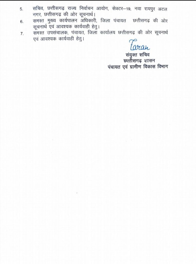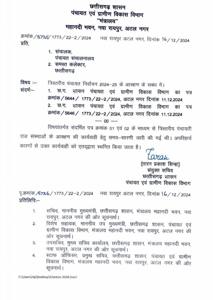 रायपुर – विषयांतर्गत संदर्भित पत्र क्रमांक 01 एवं 02 के माध्यम से त्रिस्तरीय पंचायती राज संस्थाओं के आरक्षण की कार्यवाही हेतु समय-सारणी जारी की गई थी। अपरिहार्य कारणों से उक्त कार्यवाही को एतद्वारा स्थगित किया गया है।