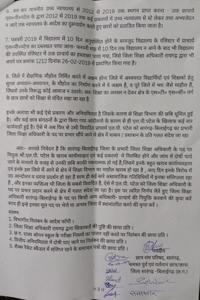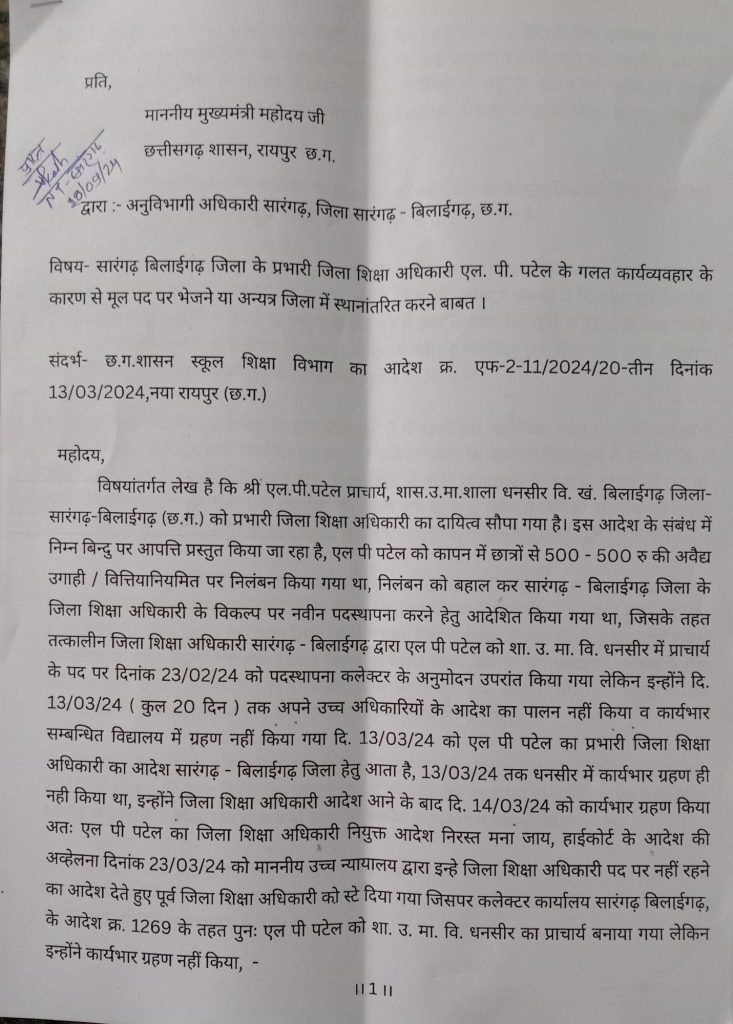 ज्ञापन के अनुसार – एल.पी. पटेल प्राचार्य, शास.उ.मा.शाला धनसीर वि.खं. बिलाईगढ़ जिला- सारंगढ़-बिलाईगढ़ (छ.ग.) को प्रभारी जिला शिक्षा अधिकारी का दायित्व सौपा गया है। इस आदेश के संबंध में निम्न बिन्दु पर आपत्ति प्रस्तुत किया जा रहा है, एल पी पटेल को कापन में छात्रों से 500-500 रु की अवैद्य उगाही / वित्तियानियमित पर निलंबन किया गया था, निलंबन को बहाल कर सारंगढ़ बिलाईगढ़ जिला के जिला शिक्षा अधिकारी के विकल्प पर नवीन पदस्थापना करने हेतु आदेशित किया गया था, जिसके तहत तत्कालीन जिला शिक्षा अधिकारी सारंगढ़ बिलाईगढ़ द्वारा एल पी पटेल को शा. उ. मा. वि. धनसीर में प्राचार्य के पद पर दिनांक 23/02/24 को पदस्थापना कलेक्टर के अनुमोदन उपरांत किया गया लेकिन इन्होंने दि. 13/03/24 (कुल 20 दिन) तक अपने उच्च अधिकारियों के आदेश का पालन नहीं किया व कार्यभार सम्बन्धित विद्यालय में ग्रहण नहीं किया गया दि. 13/03/24 को एल पी पटेल का प्रभारी जिला शिक्षा अधिकारी का आदेश सारंगढ़ बिलाईगढ़ जिला हेतु आता है, 13/03/24 तक धनसीर में कार्यभार ग्रहण ही नही किया था, इन्होंने जिला शिक्षा अधिकारी आदेश आने के बाद दि. 14/03/24 को कार्यभार ग्रहण किया अतः एल पी पटेल का जिला शिक्षा अधिकारी नियुक्त आदेश निरस्त मना जाय, हाईकोर्ट के आदेश की अव्हेलना दिनांक 23/03/24 को माननीय उच्च न्यायालय द्वारा इन्हे जिला शिक्षा अधिकारी पद पर नहीं रहने का आदेश देते हुए पूर्व जिला शिक्षा अधिकारी को स्टे दिया गया जिसपर कलेक्टर कार्यालय सारंगढ़ बिलाईगढ़, के आदेश क्र. 1269 के तहत पुनः एल पी पटेल को शा. उ. मा. वि. धनसीर का प्राचार्य बनाया गया लेकिन इन्होंने कार्यभार ग्रहण नहीं किया,