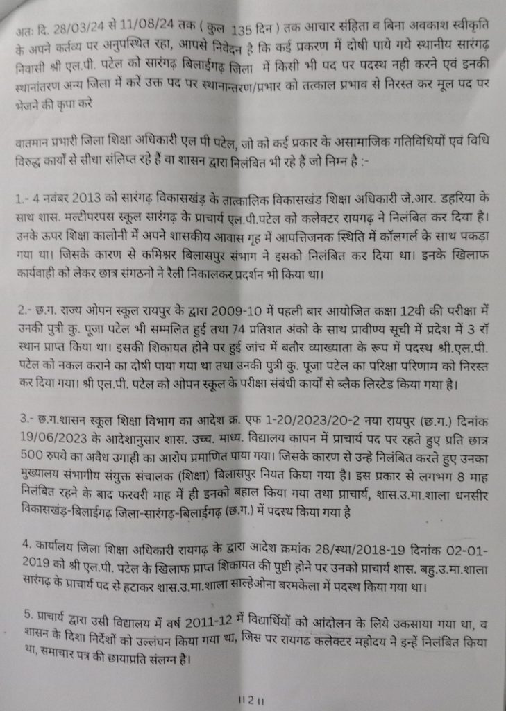 अतः दि. 28/03/24 से 11/08/24 तक (कुल 135 दिन) तक आचार संहिता व बिना अवकाश स्वीकृति के अपने कर्तव्य पर अनुपस्थित रहा, आपसे निवेदन है कि कई प्रकरण में दोषी पाये गये स्थानीय सारंगढ़ निवासी श्री एल.पी. पटेल को सारंगढ़ बिलाईगढ़ जिला में किसी भी पद पर पदस्थ नही करने एवं इनकी स्थानांतरण अन्य जिला में करें उक्त पद पर स्थानान्तरण/प्रभार को तत्काल प्रभाव से निरस्त कर मूल पद पर भेजने की कृपा करे