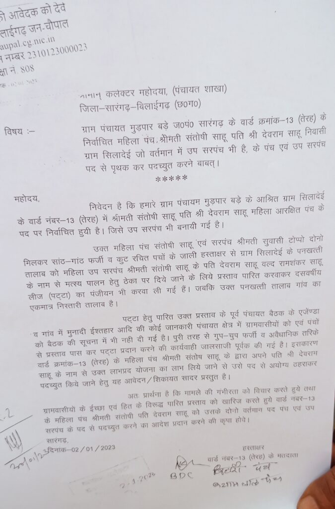 पट्टा हेतु पारित उक्त प्रस्ताव के पूर्व पंचायत बैठक के एजेण्डा व गांव में मुनादी ईश्तहार आदि की कोई जानकारी पंचायत क्षेत्र में ग्रामवासीयों को एवं पंचों को बैठक की सूचना भी नहीं दी गई है। पूरी तरह से फर्जी व अवैधानिक तरिका से प्रस्ताव पास कर पट्टा प्रदान करने की कार्यवाही व जाल साजी पूर्वक की गई है। इसकारण वार्ड क्रमांक-13 (तेरह) के महिला पंच श्रीमती संतोष साहू के द्वारा अपने पति देवराम साहू के नाम से उक्त लाभप्रद योजना का लाभ लिये जाने से उसे पद से अयोग्य ठहराकर पदच्युत किया गया है।