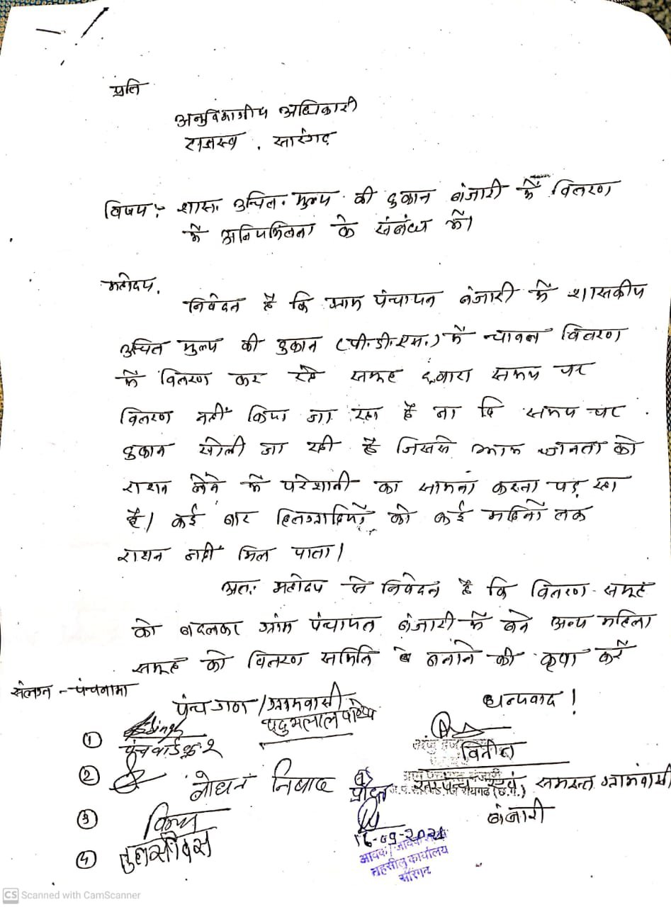 संलग्न शासकीय उचित मूल्य की दुकान बंजारी में अनिमितताओं को लेकर किया गया लिखित शिकायत।