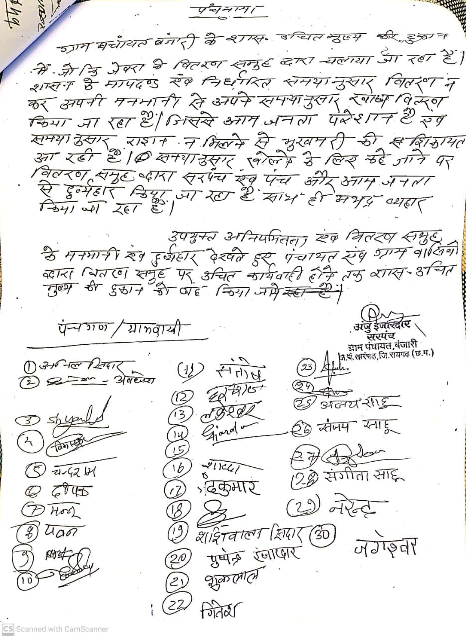 सारंगढ़:-ग्राम पंचायत बंजारी के सरपंच व पूरे गांव की जनता के द्वारा शासकीय उचित मूल्य की दुकान बंजारी संलग्न (संतोषी महिला स्व.सहायता समूह जेवरा) में अनिमितताओं को लेकर 16/09/2021 को लिखित शिकायत किया गया था लेकिन अभी तक उसमे चांज व कोई कार्यवाही नही किया गया है।